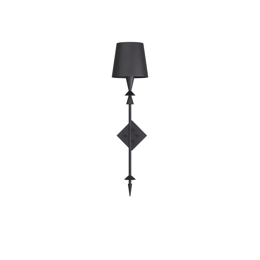 An Iron Age spear is the unlikely inspiration for our diamond-backed sconce of black gesso finish aluminum. Its unique finish and pointed support may also recall the rugged lines of a shanked fireplace poker. Topped with black gesso finished shade to keep the effect modern and moody. Damp-rated, although limited covered outdoor conditions may affect finish. Finish will vary.