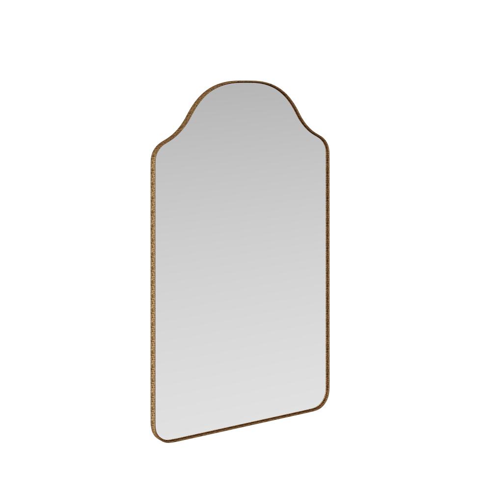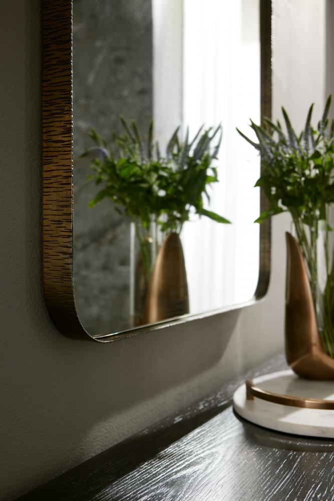 The portal shape of a classic arched mirror finds a minimalist update in Ayers. Delicately framed in chattered iron finished antique brass for extra impact. Designed to be hung vertically, it is fitted with security cleat hardware. Finish will vary.