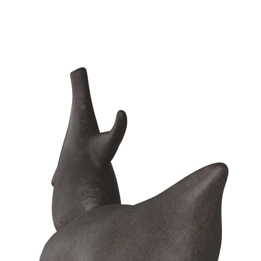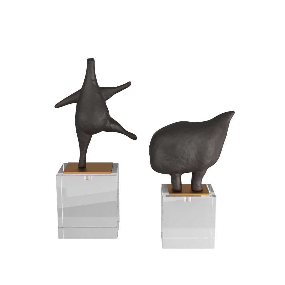 Abstract animals frolic atop bases of antique brass steel mounted on clear crystal cubes. Skillfully carved of black riverstone, this modernist duo adds a touch of whimsy to any space. Finish will vary.