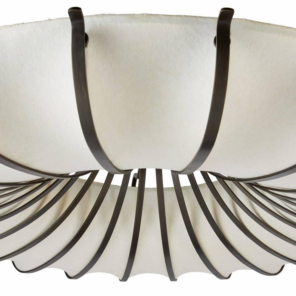 Inspired by the natural world, a jellyfish-inspired steel armature finished in English bronze creates the visual illusion of depth. Accented in waves of ivory faux vellum, this impactful fixture blends the best of flora and fauna to add a textural glow to any surface. Finish will vary.