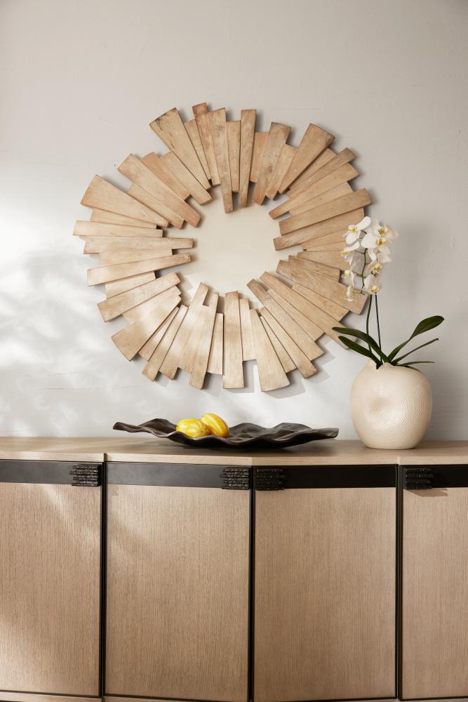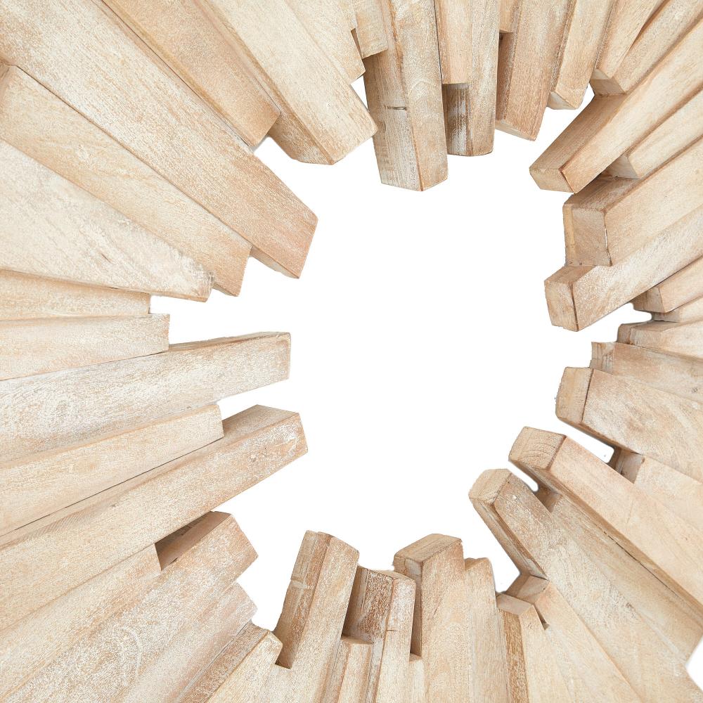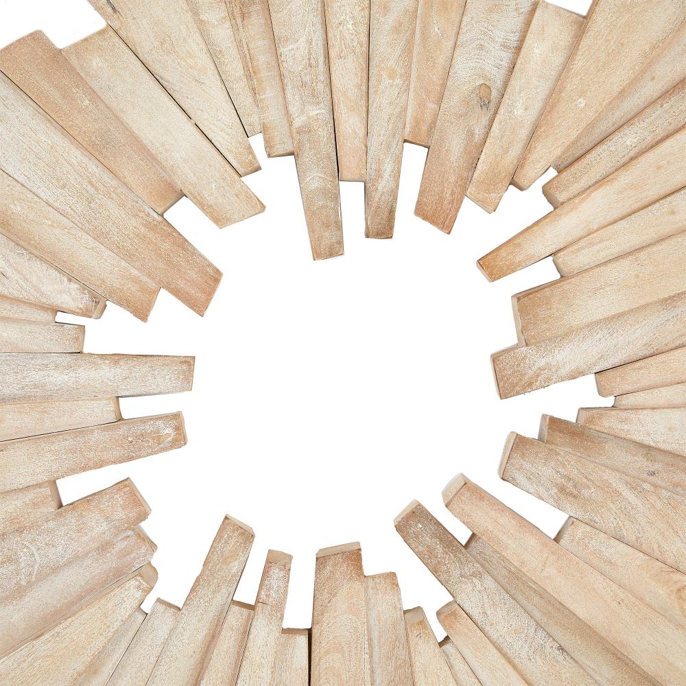 A sandblasted round of lime-washed mango wood adds an explosive impact to any wall. Crafted with a stacked sunburst shape to add dimension and laminated for durability, this chic accessory can be displayed all four ways. A D-ring attachment assures secure hanging. Finish will vary.