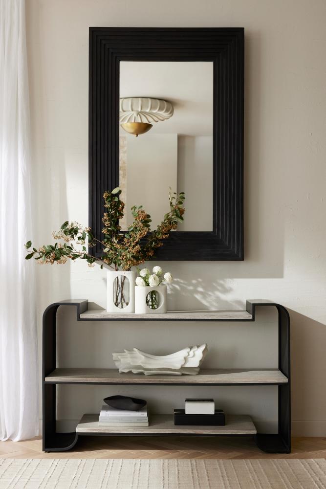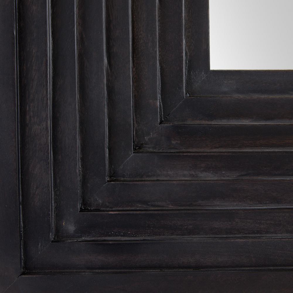 A minimal rectangular mirror is framed with stepped, muscular detailing carved to draw the eye. Crafted of mango wood of a rich ebony hue, our inverted style was designed to be hung horizontally or vertically. Accented with a secure cleat attachment at the back. Finish will vary.