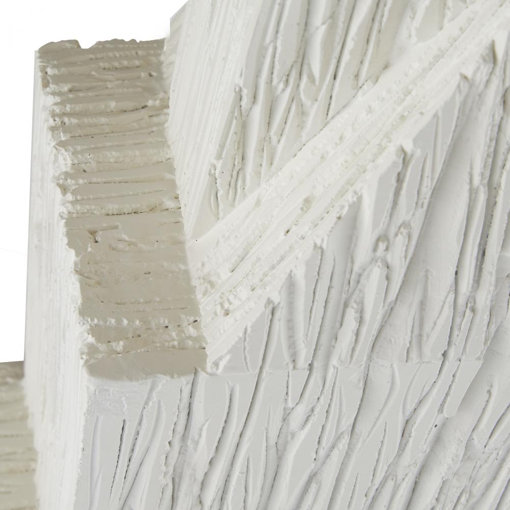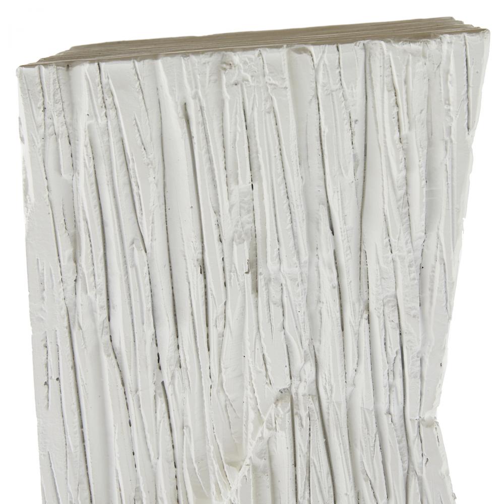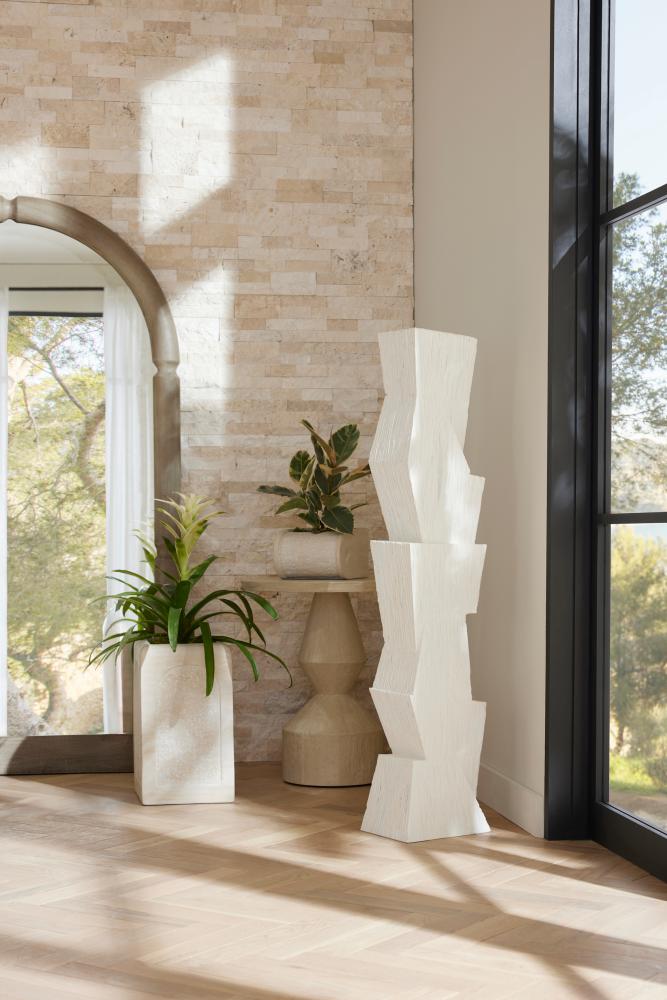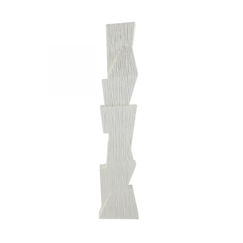 A totem of matte white resin is a commanding accent piece for any corner of the room. Designed to draw the eye to its geometric form, a faux wood finish adds a dynamic accent to the texture on its vertical surface. Finish will vary.