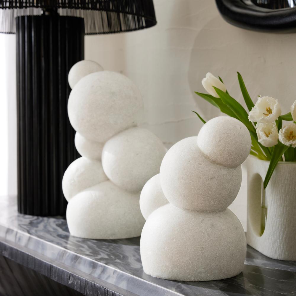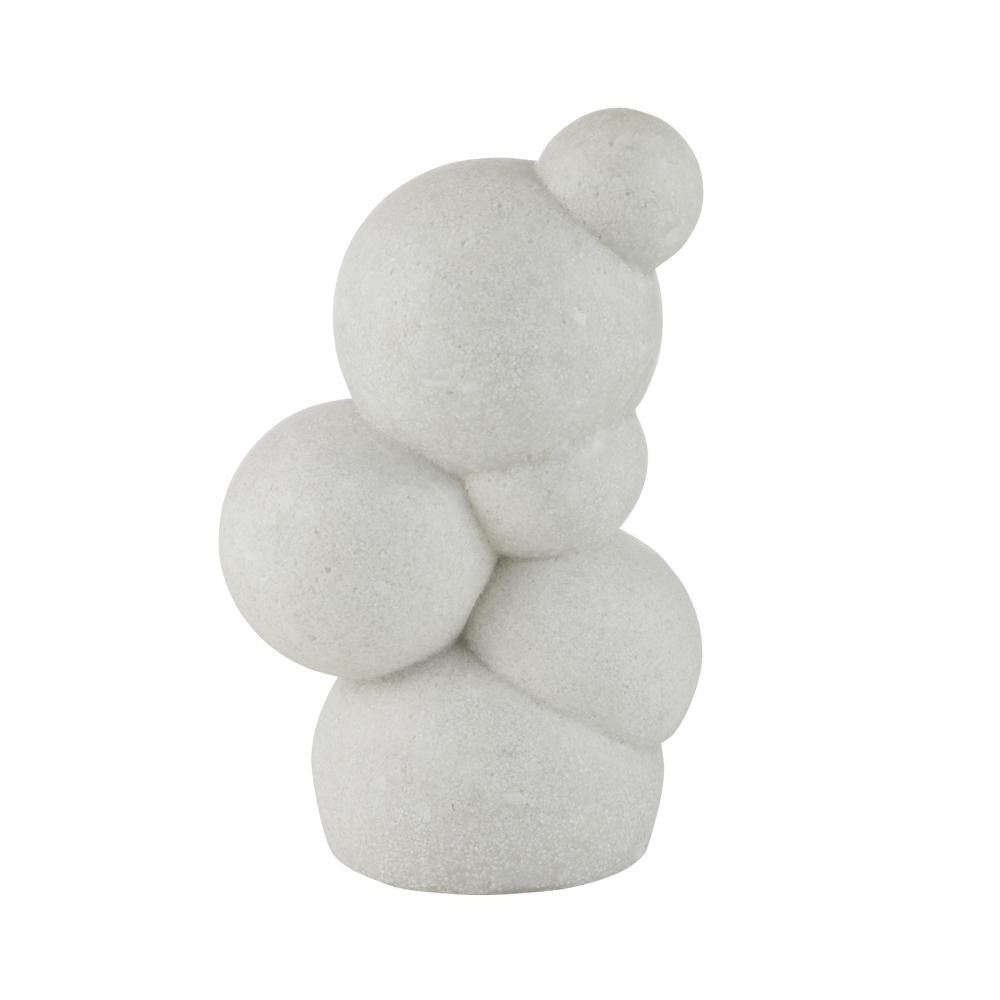 Polished spheres of ivory glass stone composite stack to recall molecular structures or organic bubbles. Each sculpture is equally impactful when displayed alone or paired. Finish will vary.