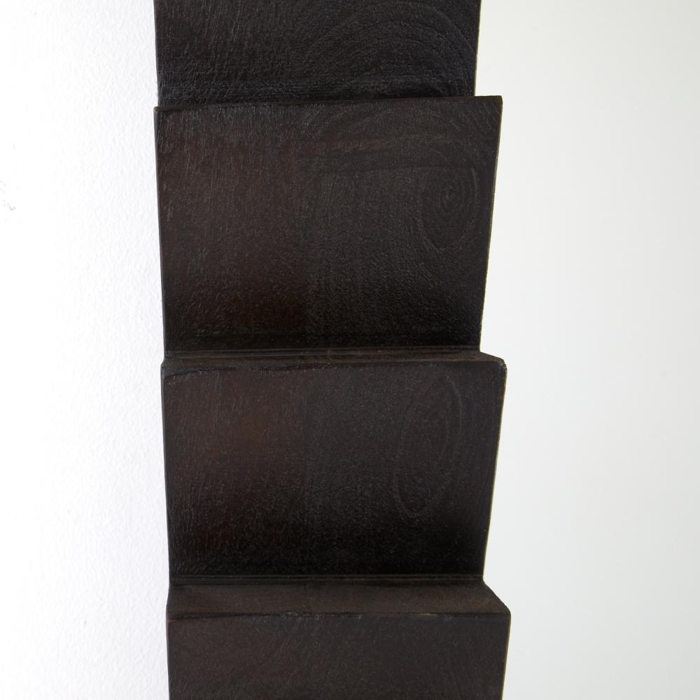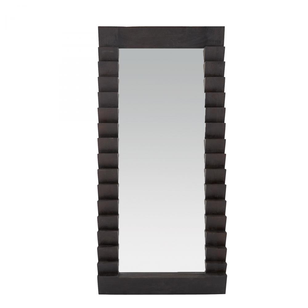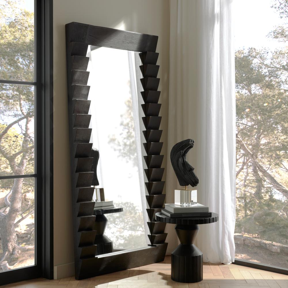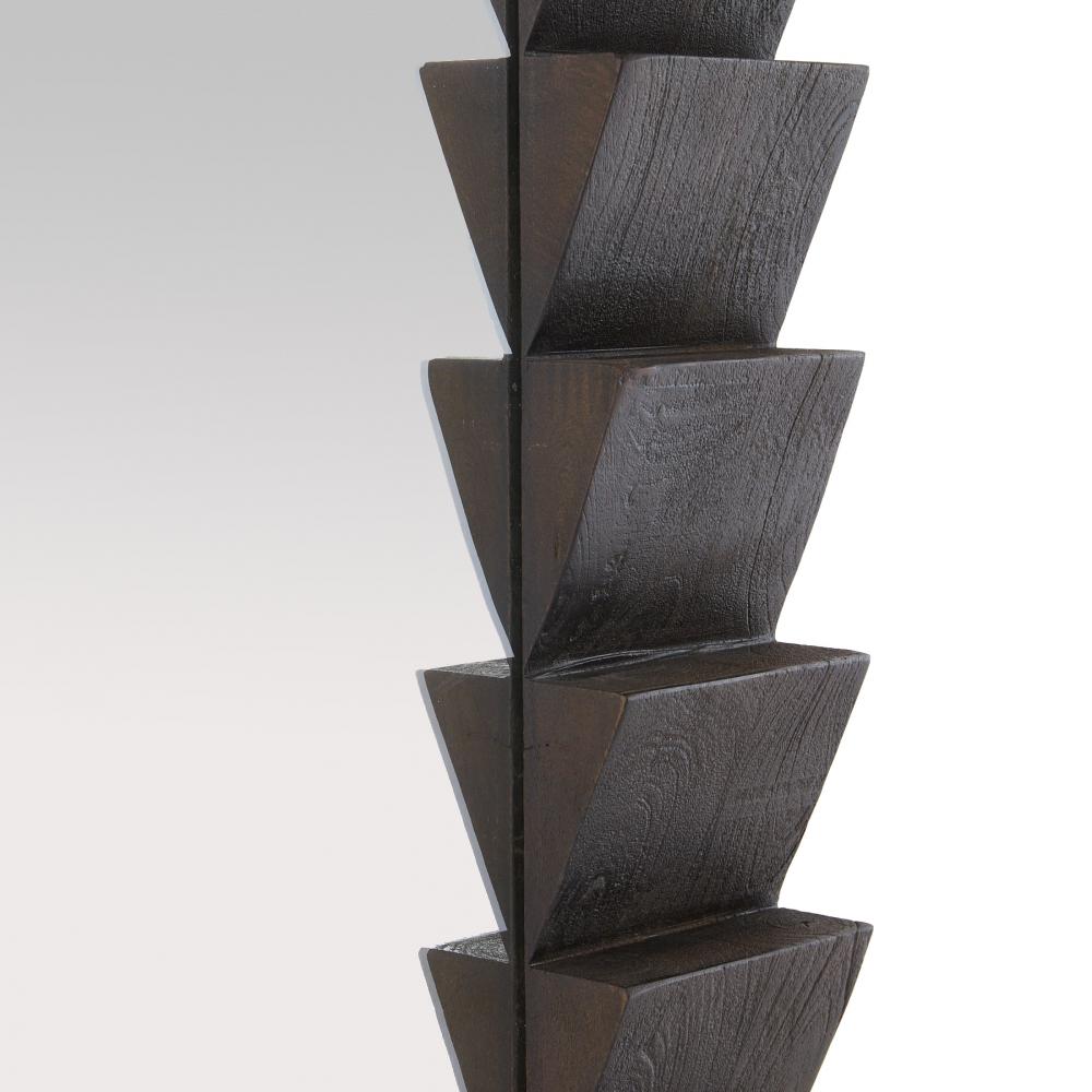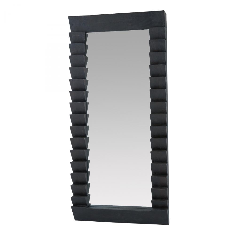 A sawtooth frame of laminated ebony mango wood offers an industrial yet rustic influence. Accented with exaggerated zigzag details, this rectangular mirror’s strong, textured finish lends a superpowered effect to any interior. Designed to be hung vertically, horizontally, or angled on the floor, it is secured with a cleat attachment at the back. Finish will vary.