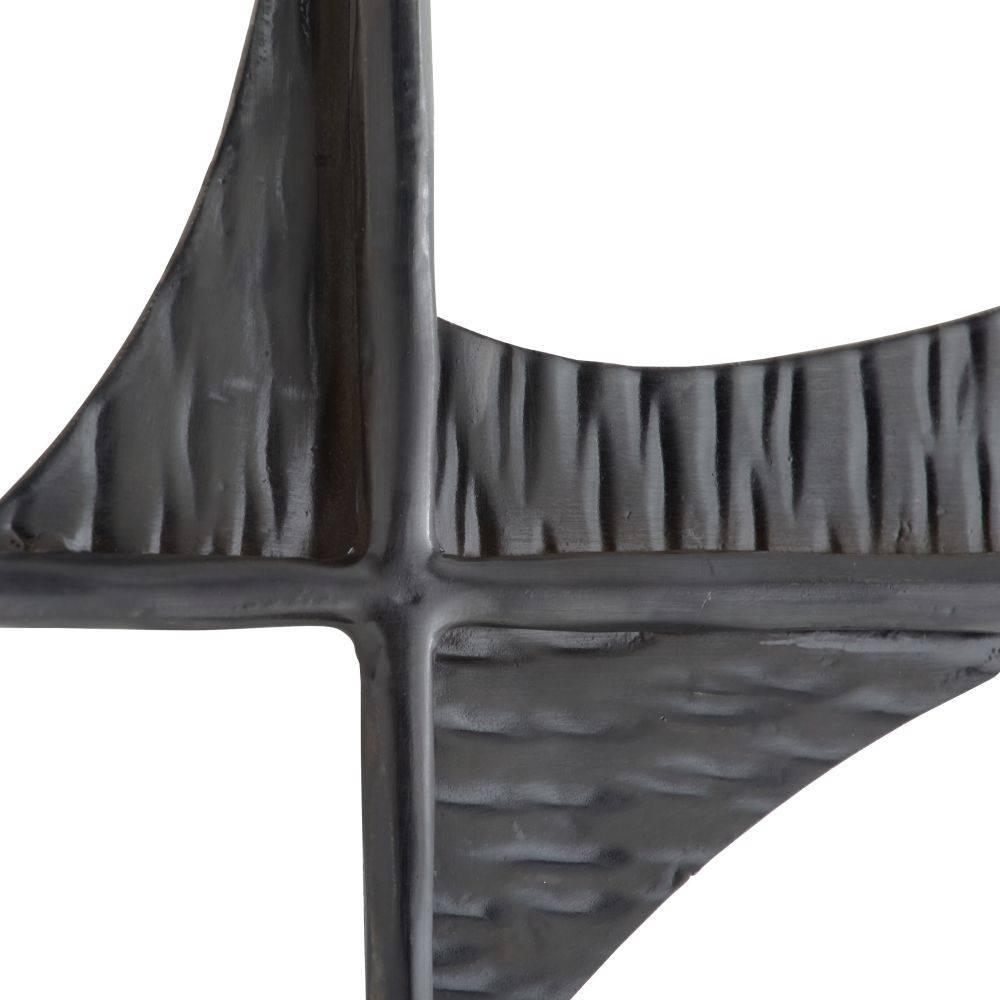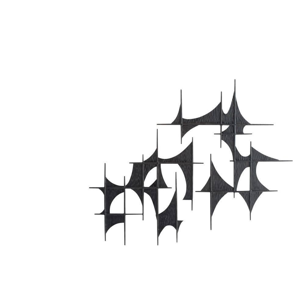 A trio of plaques of black-forged iron draw from the best of mid-century Brutalist forms. With the look of sails stretched between posts, the textured angles and curves are elegant on their own and even more impactful when displayed together. Arrange them in multiple ways to create a custom look. Keyhole attachment for secure hanging.