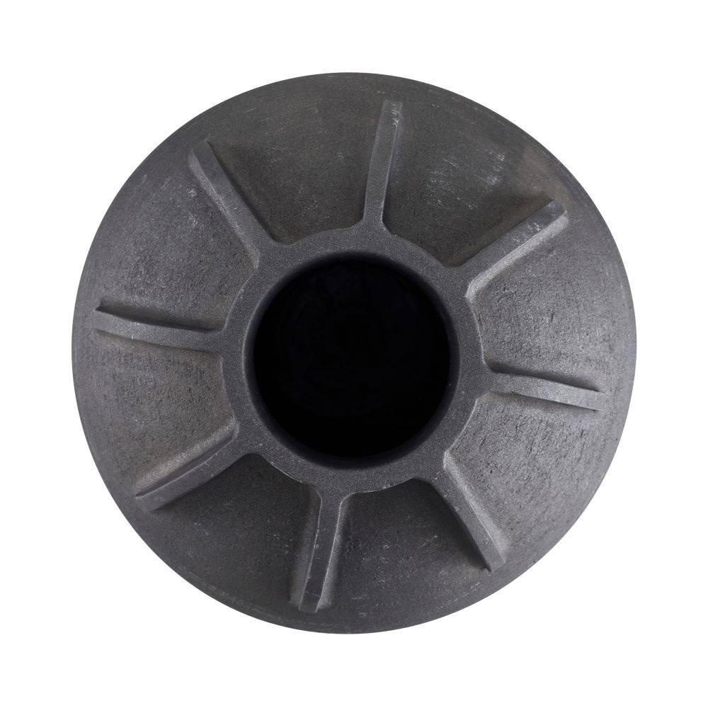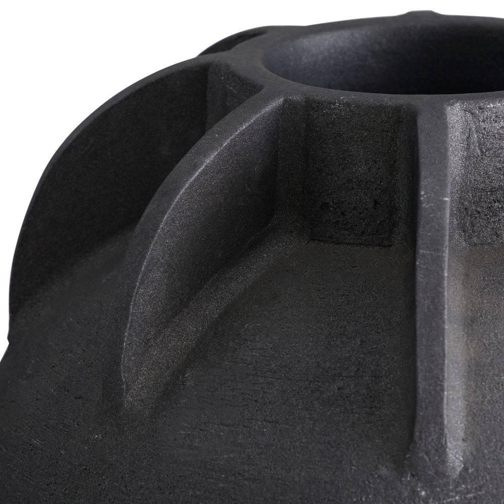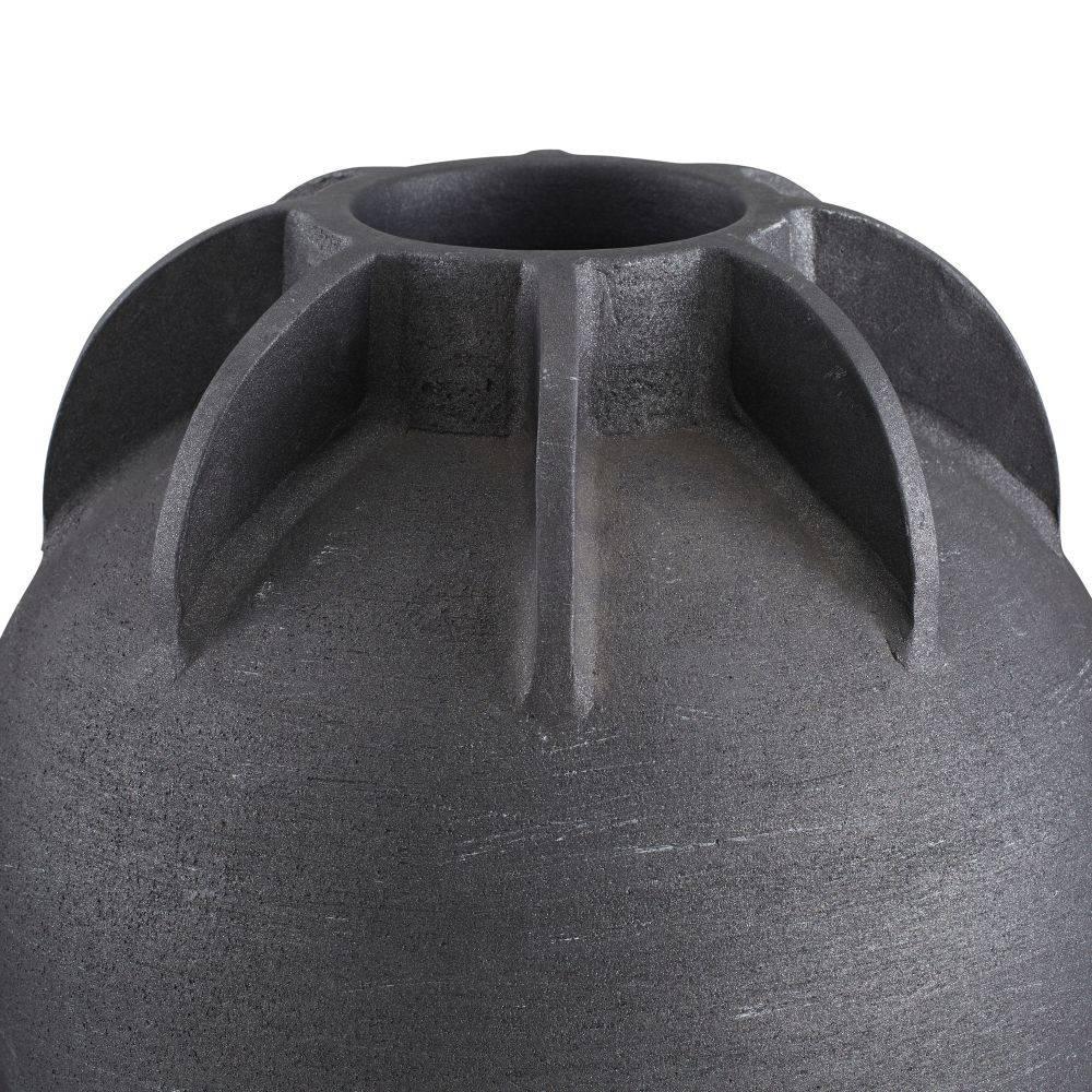 Our classical urn resembles a traditional olive jar. Substantial in scale, this rich dimensional matte charcoal terracotta accessory is sculpted with armor-inspired details at the mouth. A removable rubber stopper is at the bottom for easy drainage. Finish will vary.