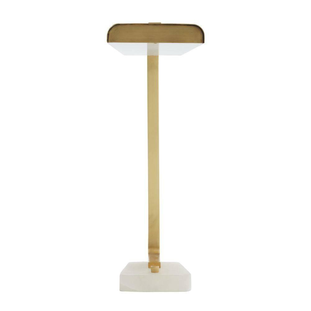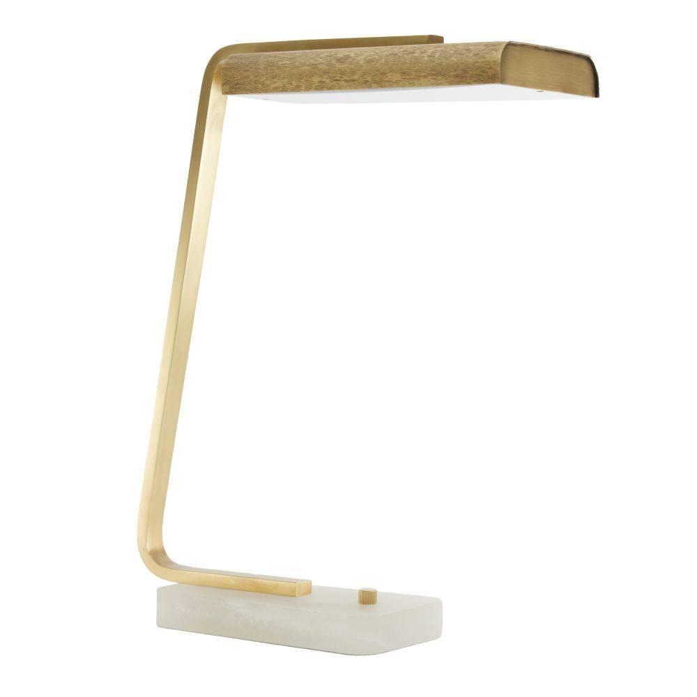 Our angular update of a classic, this LED light offers a restrained luxury wherever it is placed. A paddle shade of chattered antique brass-plated iron mirrors the shape of the white alabaster base. The Genevieve task lamp features a dimmer switch that adjusts the illumination to your needs. Finish will vary.