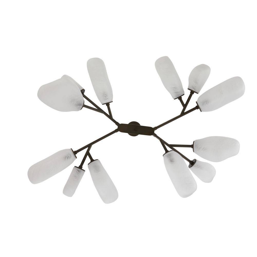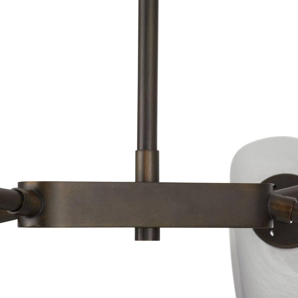 Billowing, modern frosted glass rounded cubes lend an organic feeling to our impactful chandelier. Each irregular shade differs slightly, giving this sculptural fixture a unique presence. Suspended from a branched form of English bronze-plated steel with matching pipe. Damp-rated, although limited covered outdoor areas may affect finish.