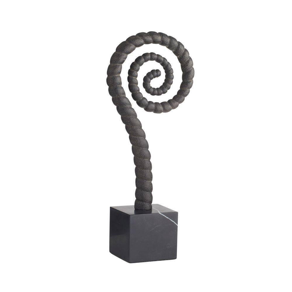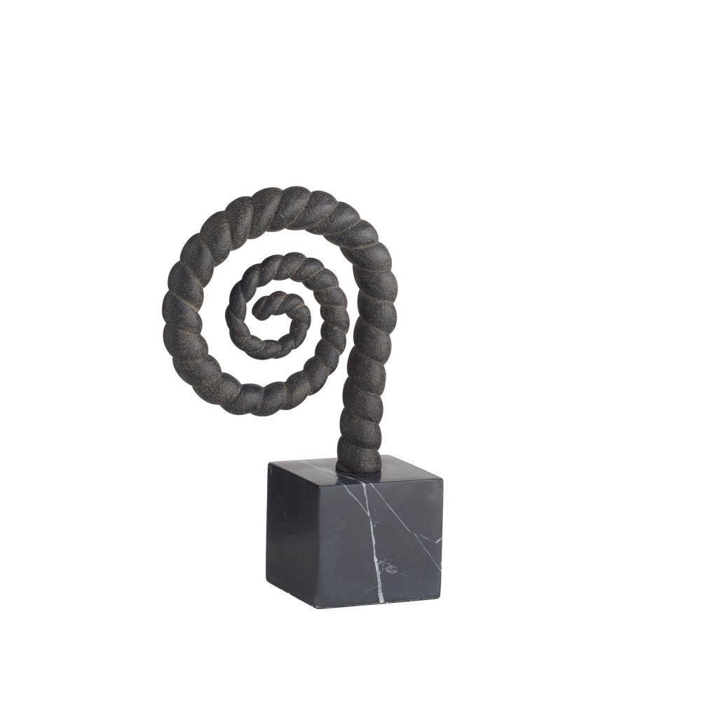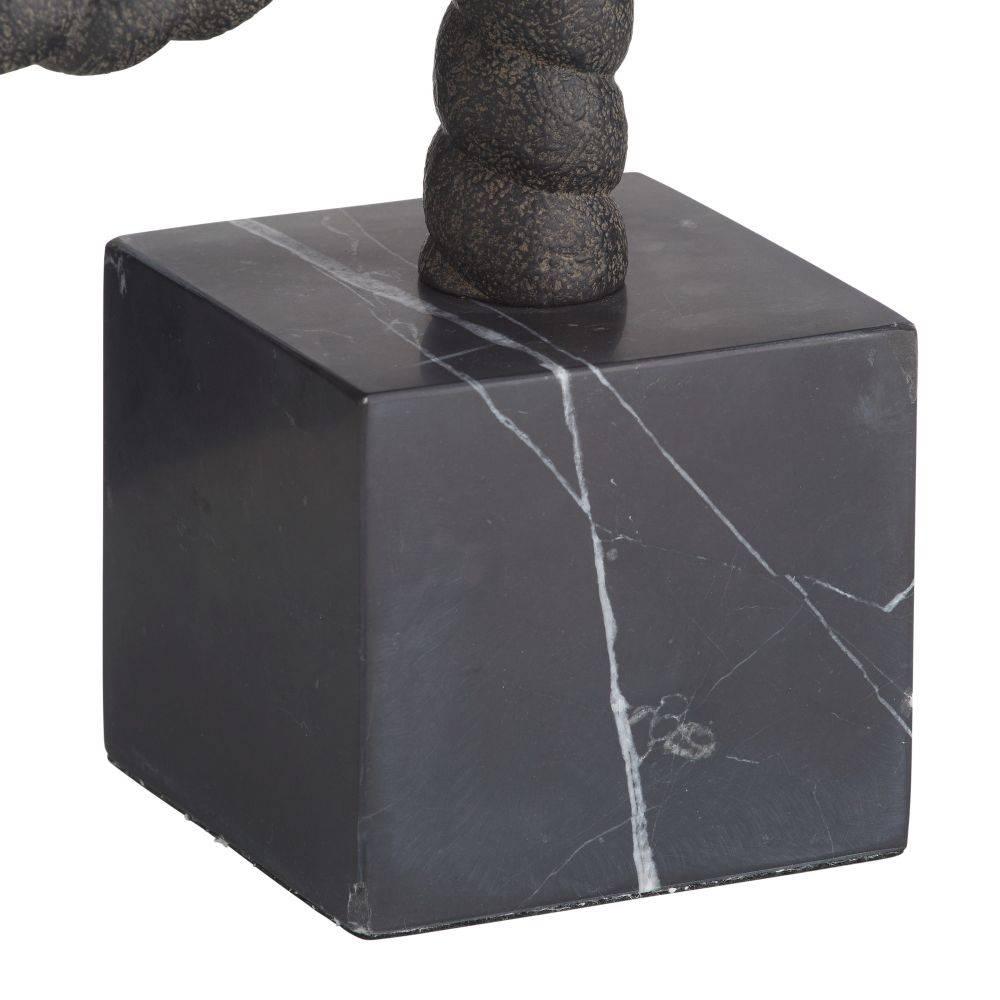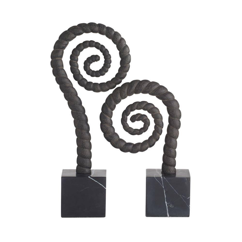 Our coal resin sculptures mimic the curved silhouette of a ram's horn. Black marble bases streaked with white veins makes this sculpture sturdy and stylish. Can be used as a pair of bookends, their textural finish lends implied movement to your shelfscape. Finish will vary.