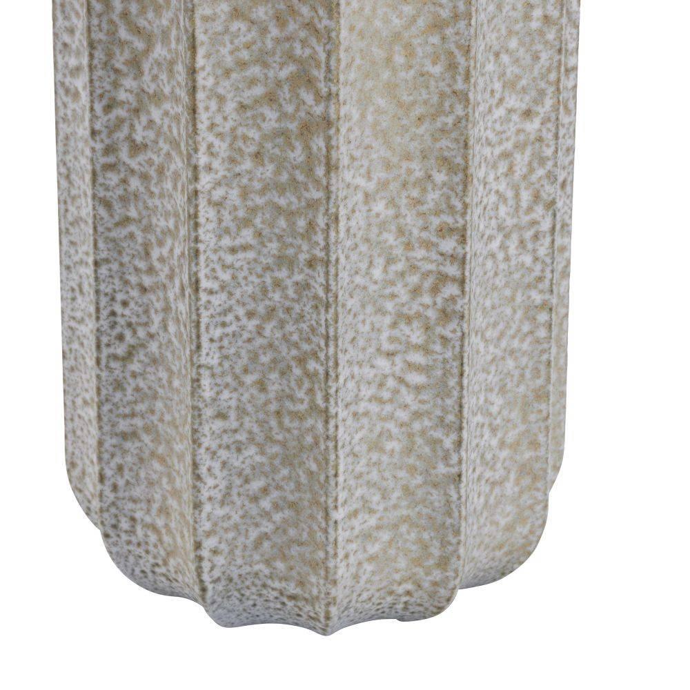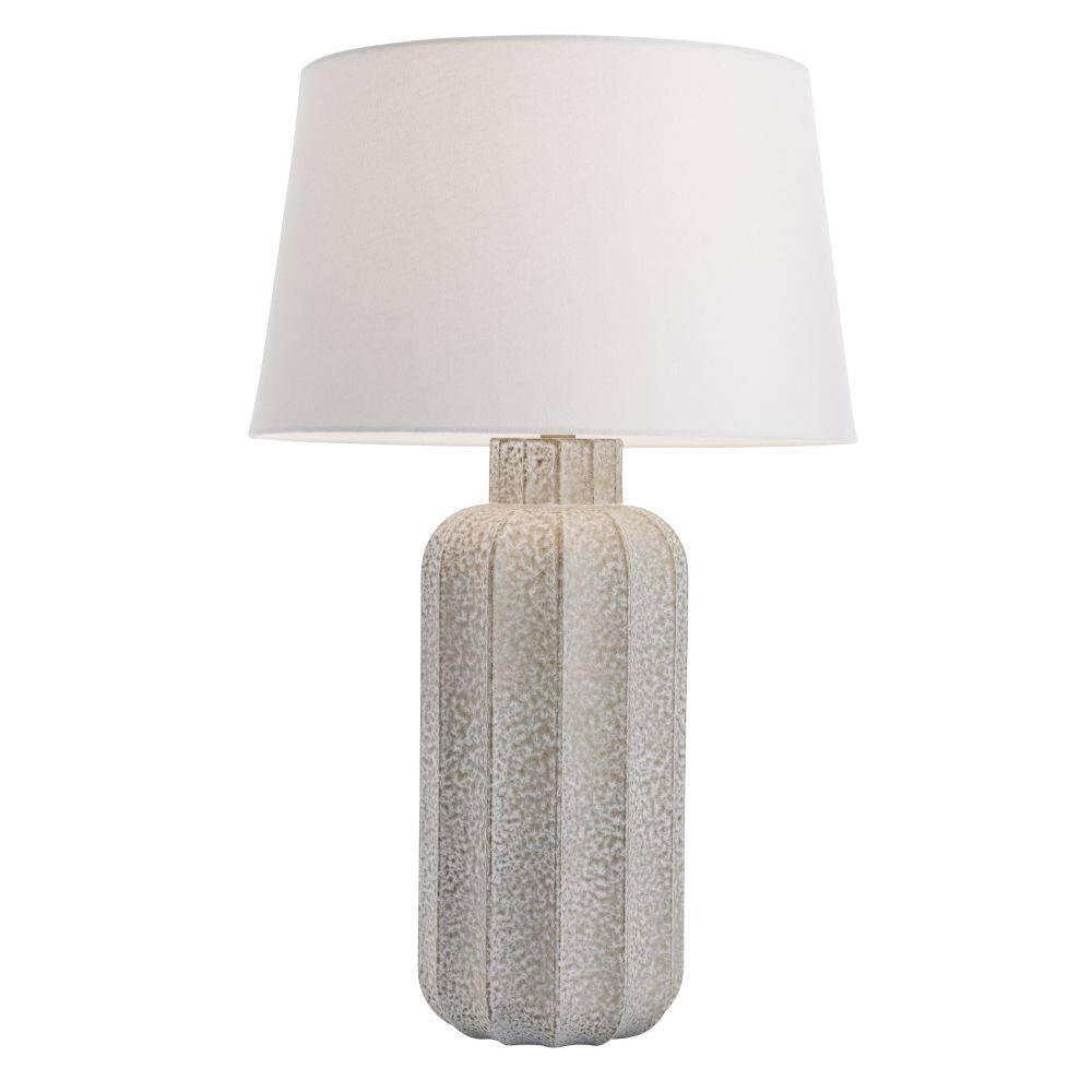 A traditional architectural form reinvented on a larger scale in textural porcelain. Glazed in a lunar reactive finish, its surface recalls a freeform coral reef. Accented with antique brass-plated steel hardware and sphere-shaped finial. Off-white linen drum shade lined in off-white cotton. Finish will vary.