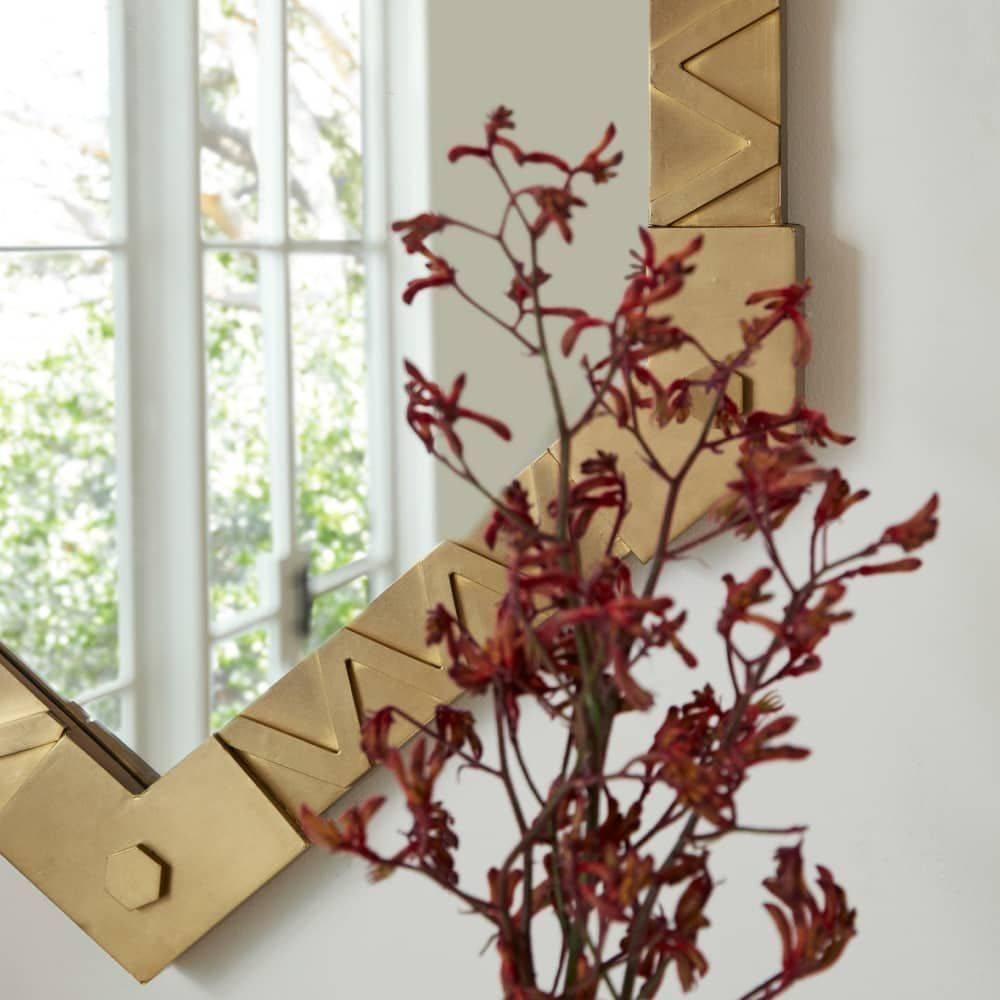 The useful and beautiful aesthetics of the Arts and Crafts movement inform our Holt mirror. Crafted of antique brass-plated iron, the layered metalwork of this handcrafted style adds interest to its geometric form. Designed to be displayed both vertically and horizontally. Secured at the back with a cleat attachment.