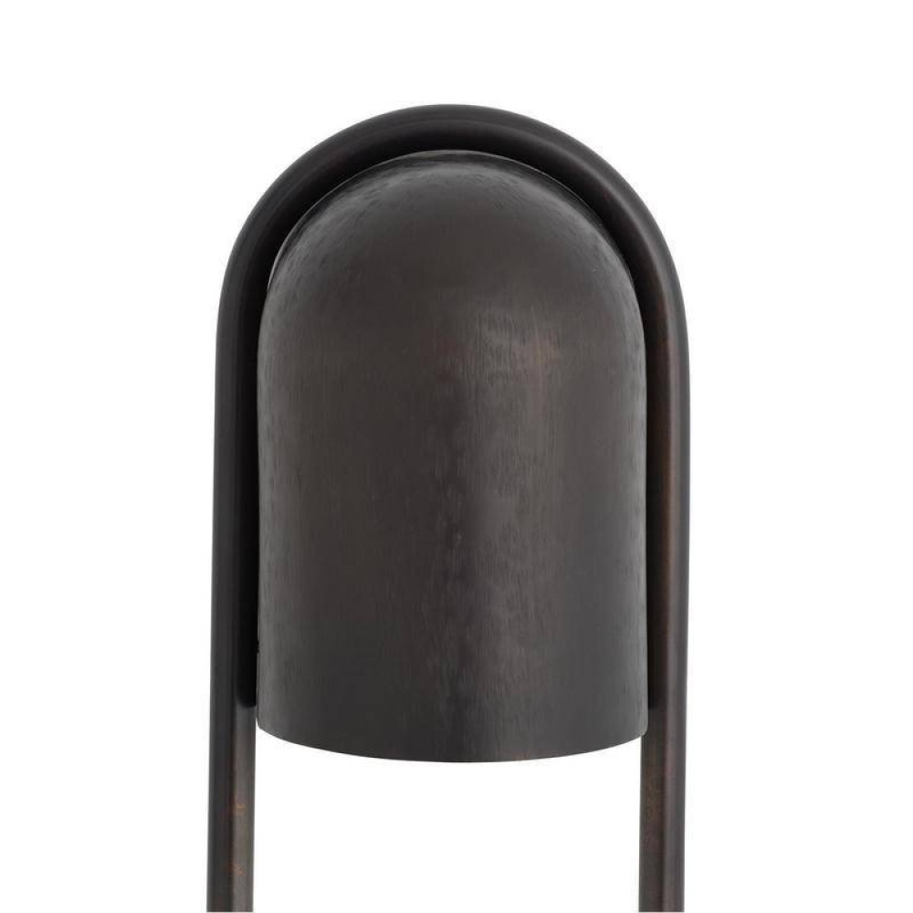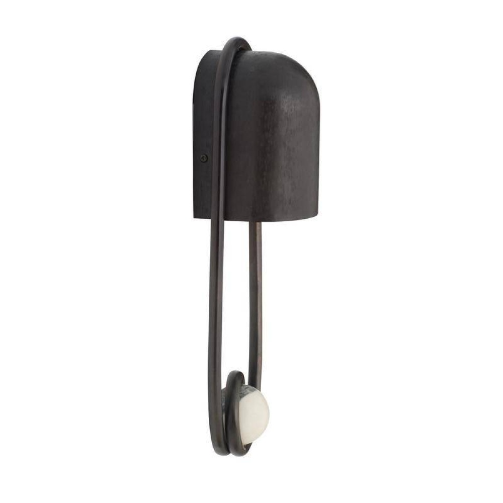 A stirrup-shaped sconce captures a white and gray marble sphere in a loop of English bronze-plated steel. The hooded chattered English bronze-plated steel silhouette was devised to deliver a moody wash of light across the wall and can be staged in multiples for brighter illumination. Finish will vary. Damp-rated, although limited, covered outdoor conditions may affect finish.