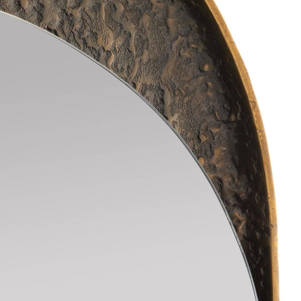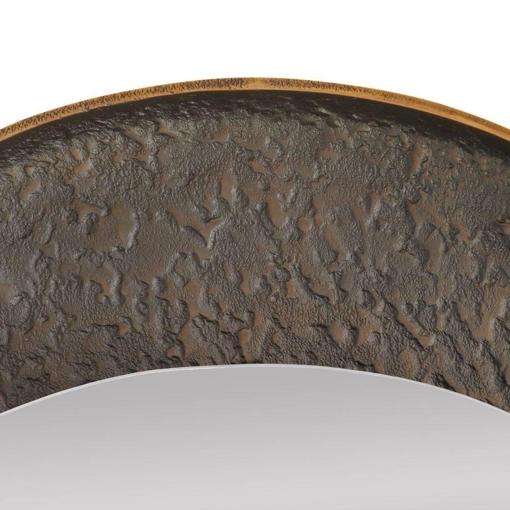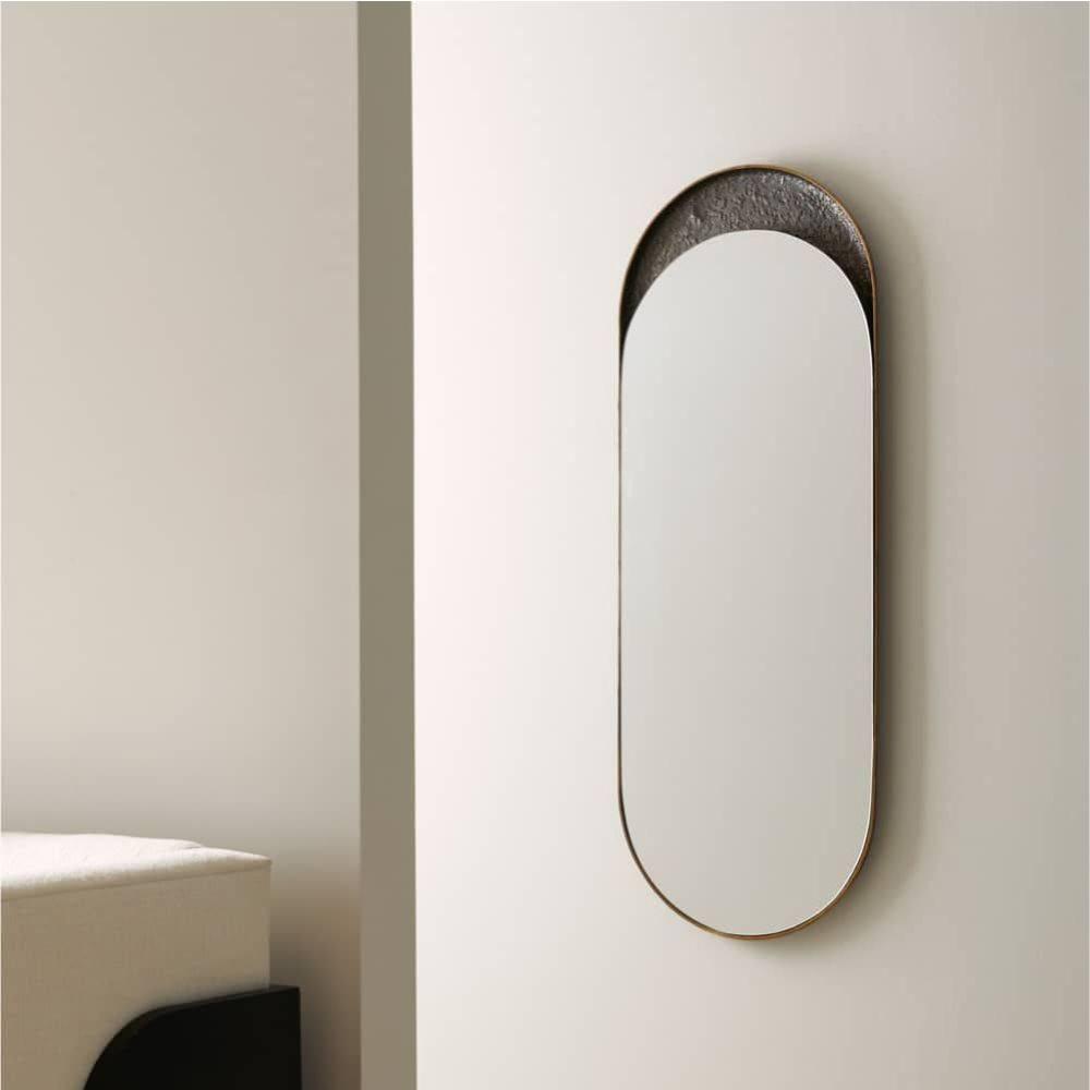 Playing with the concept of filled and unfilled forms, the Inset long mirror's smooth glossy surface is set within a deeply textured, bronze plated aluminum form as if it were being poured into a void. The offset, antique brass palted aluminum pill shaped elements create a sense of sliding motion, making the mirror a uniquely modern, dynamic choice for interiors of all kinds. The Inset long mirror can be hung vertically or horizontally to create unique compositions. Finished with a cleat at the back for security. Finish will vary.