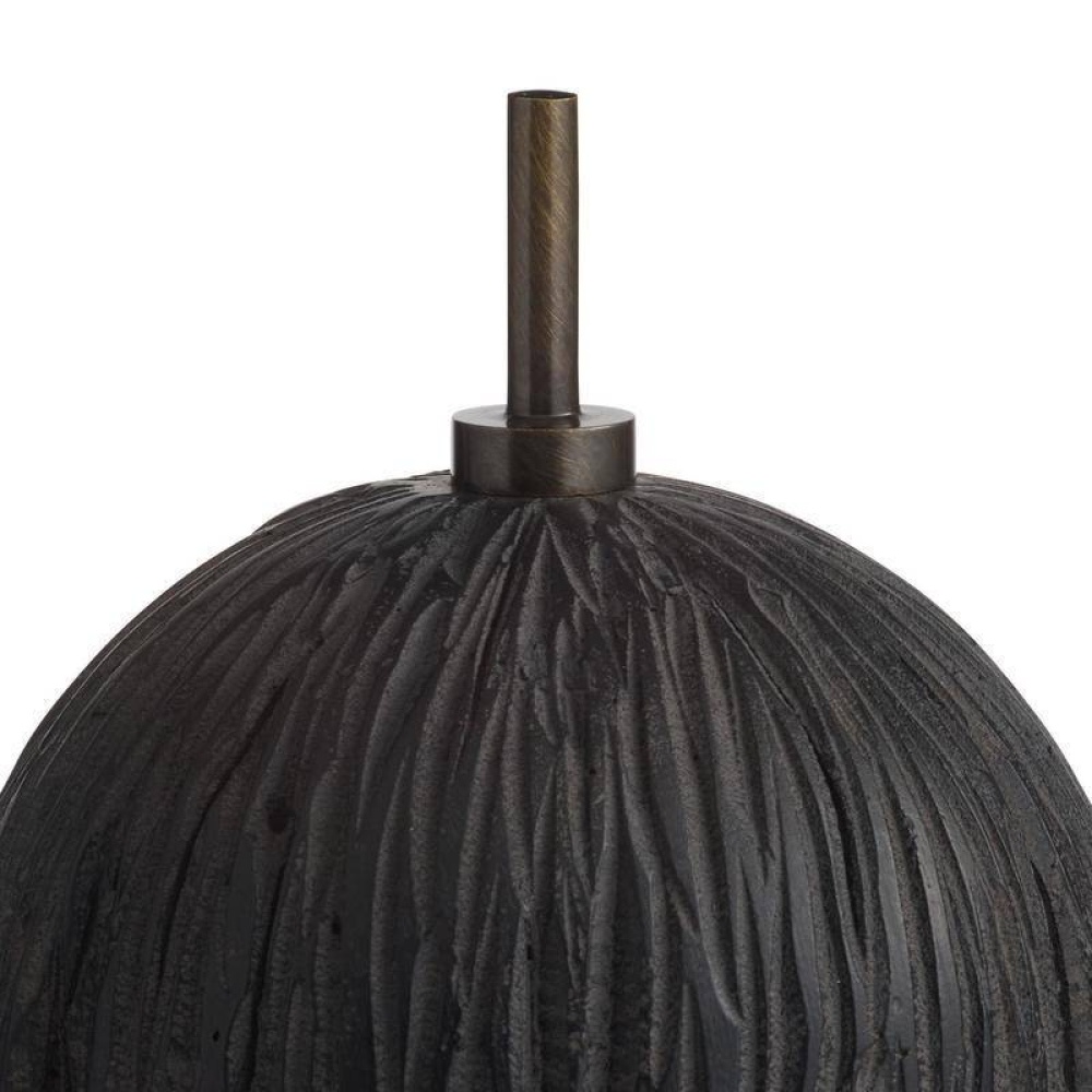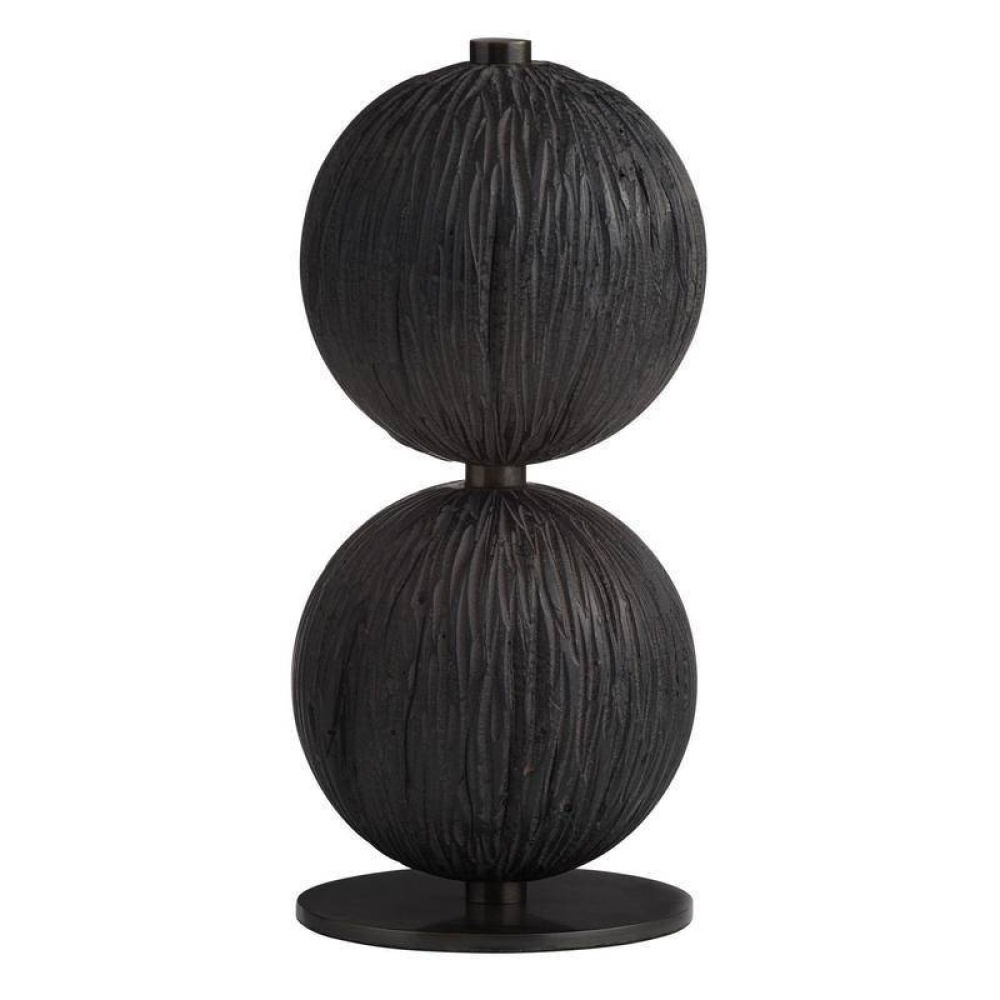 This set of organic forms is inspired by Japanese shou sugi ban is reinterpreted in ebony resin. Each rounded sculpture is reminiscent of a seed pod, pierced with an accent English bronze steel. Two of the trio are mounted securely on a base.