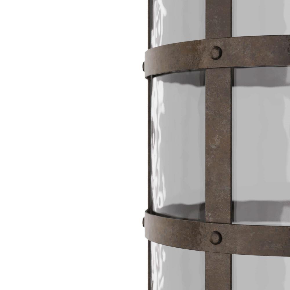 AS A BLACKENED IRON BASKET FITTED WITH A CLEAR HAMMERED GLASS CYLINDER, THIS AMPLE VASE IS PERFECT FOR LARGER LIMBS AND BRANCHES, OR FILL IT WITH ORANGES, LEMONS, OR GREEN APPLES AS A COLORFUL SCULPTURE.