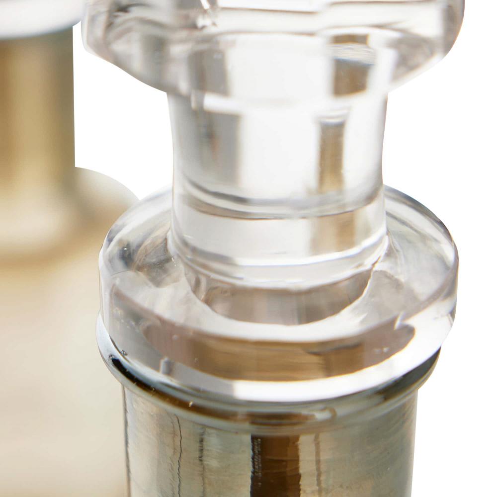 A SOPHISTICATED WAY TO SERVE UP FAVORITE LIBATIONS, THIS PAIR OF TALBANY DECANTERS MAKE FOR COMPANION SILHOUETTES. CREATED IN CLEAR AND SMOKE LUSTER GLASS, WITH FACETED, DECORATIVE GLASS STOPPERS, THE SIZABLE VESSELS IMPART A MOODY MODERNITY TO ANY BAR. FINISH WILL VARY.