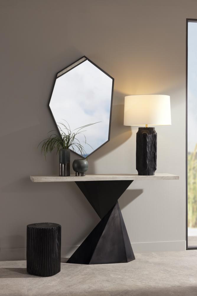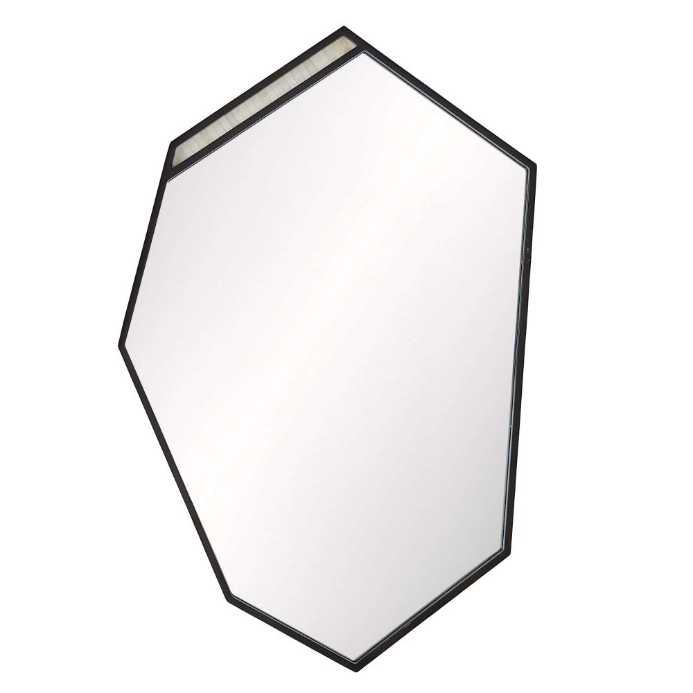 THE TALLAND, WITH ITS BOLD, ANGULAR SILHOUETTE, IS REMINISCENT OF A SOLDIER’S SHIELD. DETAILED WITH A CONTRASTING STRIP OF NATURAL BONE INLAY, THE FACETED, BRONZE IRON FRAMED MIRROR CUTS A STRIKING REFLECTION. THE WALL MIRROR IS FITTED WITH A CLEAT FOR HANGING. FINISH WILL VARY.