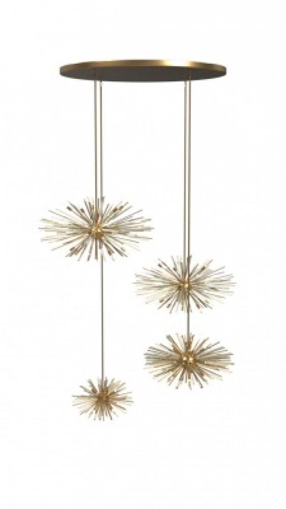 Inspired by the iconic Sputnik design, the Palisades Ave. Collection showcases a dynamic arrangement of varying-sized spokes radiating from a central spear base. This striking fixture is beautifully accented with a mix of glass, metal rods, and glowing bulbs, creating a captivating play of light and form that adds bold sophistication to any space.