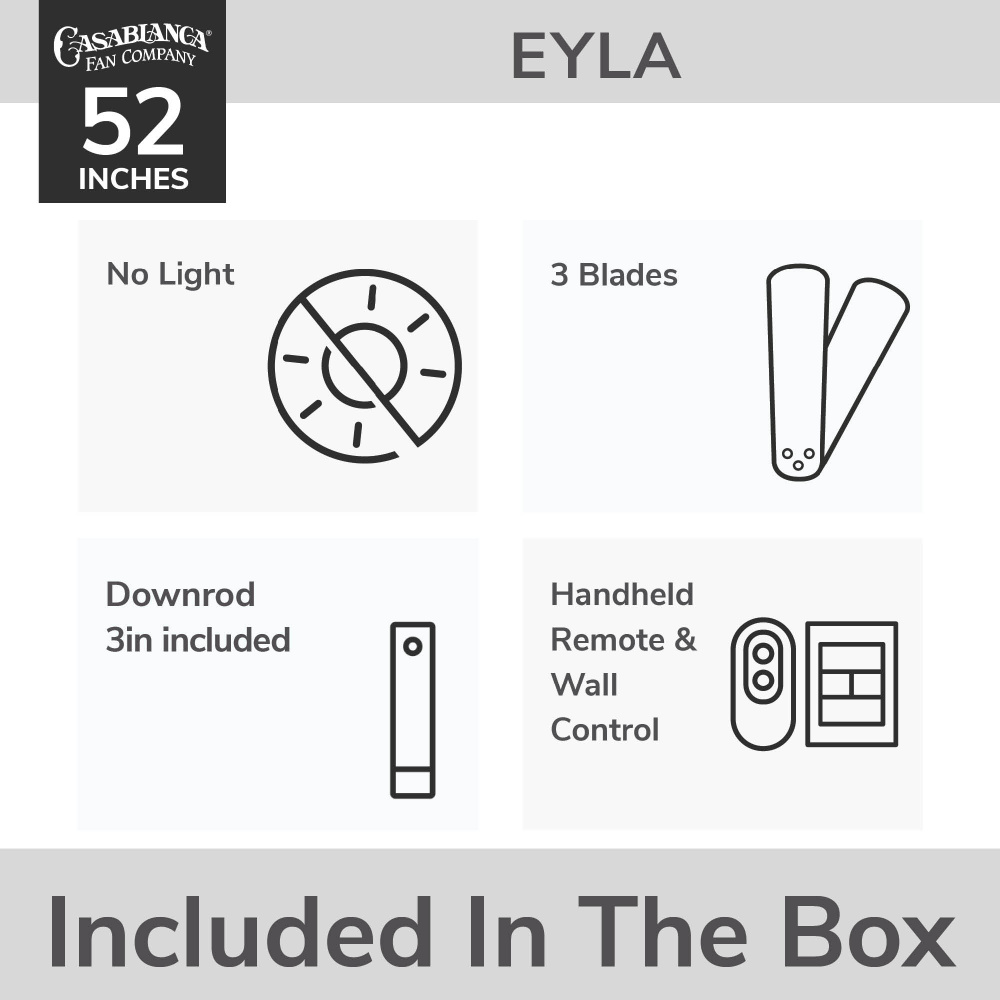 The Eyla Ceiling Fan delivers elevated comfort with effortless style and energy-saving performance. Designed to complement covered outdoor spaces like patios and screened porches, it's damp-rated and built for year-round use. The ENERGY STAR® certification means it's 64% more efficient than standard fans, powered by a whisper-quiet 6-speed Eco Whisper DC motor with reversible functionality. A handheld remote lets you adjust speed, light, and seasonal settings with ease. Prefer a sleek, light-free design? Use the included No Light Cap for a streamlined finish. With a standard 3-inch downrod and extension options available, the Eyla is a dependable, design-forward choice backed by Hunter’s Limited Lifetime Motor Warranty.