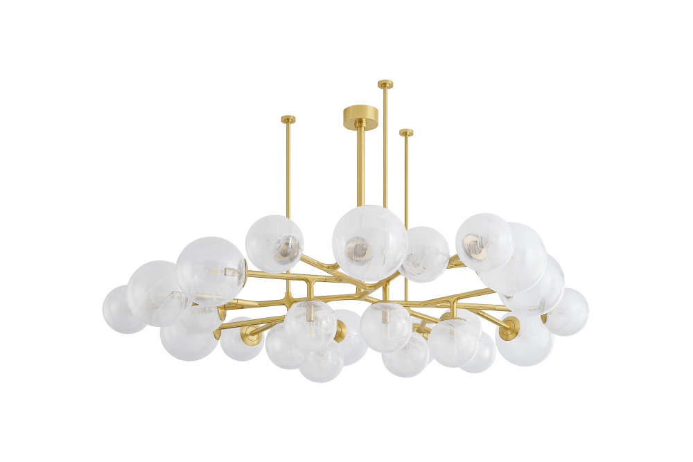 The Glasgow family of chandeliers and linears captures the old-meets-new vibrancy of its namesake Scottish city. Resembling celestial bodies in the night sky, the Remolino Blanco swirled glass globes are suspended from a branch-inspired Vintage Polished Brass frame. Choose from different formats to suit your space, from 8 to 24 lights.