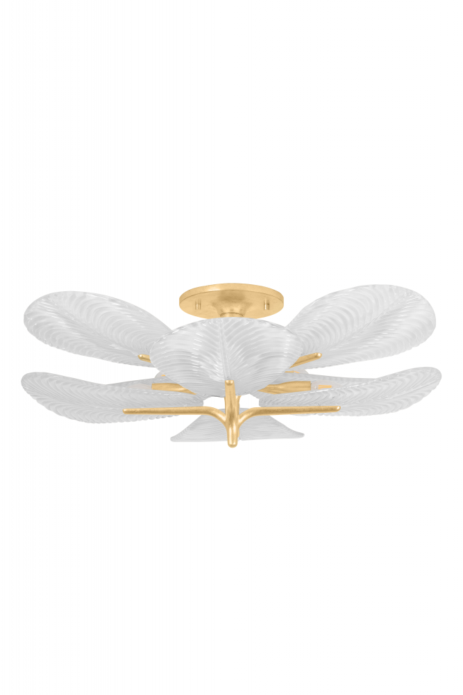 The layered botanical design of the Kamal semi-flush mount adds a pop of freshness overhead. Beautiful leaf patterns have been etched onto each piece of textured glass, creating a dynamic wave-like outward diffusion of light. The candelabra cluster positioned just beneath the ceiling canopy casts light through the layers to create a warm glow around the room. Available in two sizes and finished in Vintage Gold Leaf, Kamal makes a fresh statement in hallways, bedrooms, and beyond.