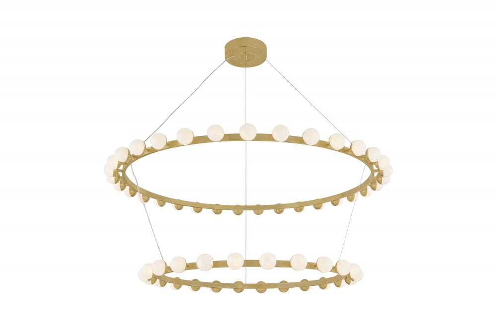 Elements of repetition and scale are skillfully balanced in the Linus chandelier to create a striking visual impact. Finished in Vintage Brass, the concentric rings that form the framework support a series of globes. Marked by a unique, crackled effect, the antique quality of the White Luna glass adds an air of artistry. What sets this family apart is its versatility: despite the five distinct options, only three rings are used to create an array of configurations.
