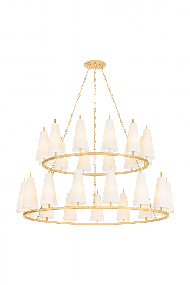 While simplistic, the natural silk shades and circular motifs of the Tirana family nod to a nautical spirit. The conical shades provide a contemporary lightness to the traditional silhouettes. By contrast, the delicately textured Vintage Gold Leaf metalwork catches the light like a modish bangle bracelet. Available as a 1-light sconce and a 12-light, 15-light, and 27-light chandelier, Tirana produces warm, refined lighting for transitional spaces.