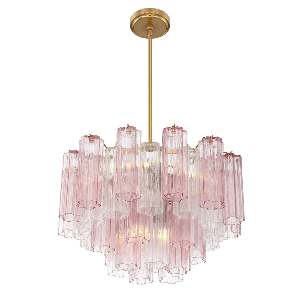 The captivating Addis Lighting Collection is a modern-day interpretation of the iconic mid-century Tronchi chandelier. Inspired by its predecessor's sleek lines and geometric shapes, the Addis features a polished Chrome or Aged Brass metal frame that exudes sophistication and style. Its unique design showcases transparent tiers of textured Tronchi glass tubes, forming a mesmerizing 5-point rounded star shape. Choose from a range of glass colors, including clear, amber, smoke, and white, or the stunning Autumn option, which features a captivating multicolor disposition of amber, clear, and smoke Tronchi glass. The Addis Lighting Collection offers various sizes and finishes, allowing you to find the perfect fit for your space while adding a touch of timeless elegance.