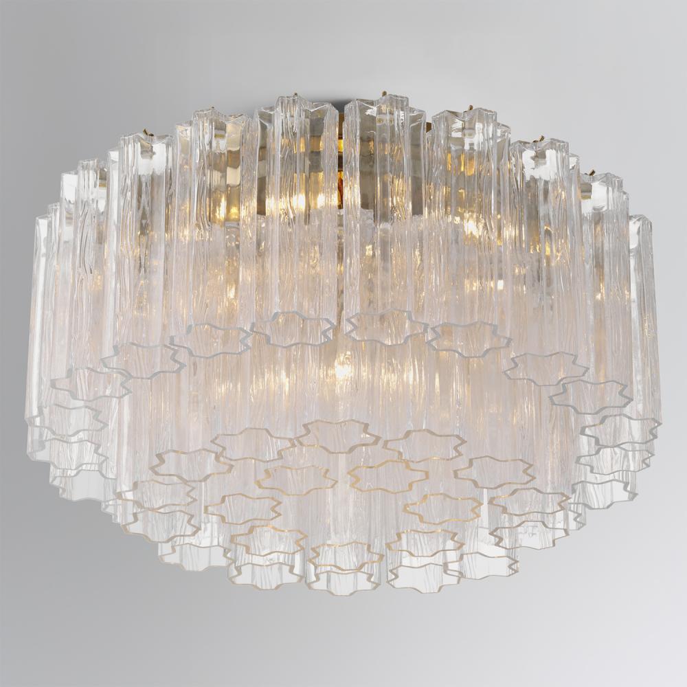 The captivating Addis Lighting Collection is a modern-day interpretation of the iconic mid-century Tronchi chandelier. Inspired by its predecessor's sleek lines and geometric shapes, the Addis features a polished Chrome or Aged Brass metal frame that exudes sophistication and style. Its unique design showcases transparent tiers of textured Tronchi glass tubes, forming a mesmerizing 5-point rounded star shape. Choose from a range of glass colors, including clear, amber, smoke, and white, or the stunning Autumn option, which features a captivating multicolor disposition of amber, clear, and smoke Tronchi glass. The Addis Lighting Collection offers various sizes and finishes, allowing you to find the perfect fit for your space while adding a touch of timeless elegance.
