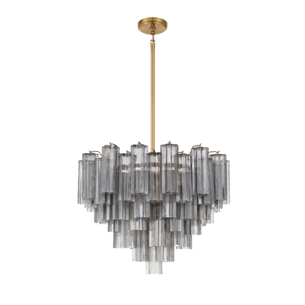The captivating Addis Lighting Collection is a modern-day interpretation of the iconic mid-century Tronchi chandelier. Inspired by its predecessor's sleek lines and geometric shapes, the Addis features a polished Chrome or Aged Brass metal frame that exudes sophistication and style. Its unique design showcases transparent tiers of textured Tronchi glass tubes, forming a mesmerizing 5-point rounded star shape. Choose from a range of glass colors, including clear, amber, smoke, and white, or the stunning Autumn option, which features a captivating multicolor disposition of amber, clear, and smoke Tronchi glass. The Addis Lighting Collection offers various sizes and finishes, allowing you to find the perfect fit for your space while adding a touch of timeless elegance.