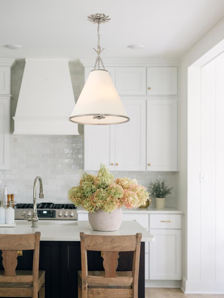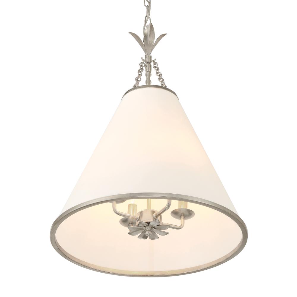 White silk cone shade dressed with delicate metal leaf accents.