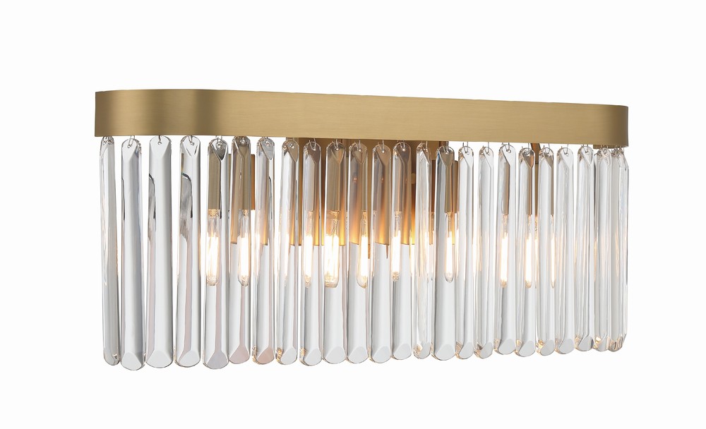 Art deco design is exemplified in this Emory collection bathroom vanity. The collection features a row of smooth glass prisms hanging from a steel frame. Both the Black Forged and Modern Gold finishes, add all the sparkle and glamour you need in a fixture.