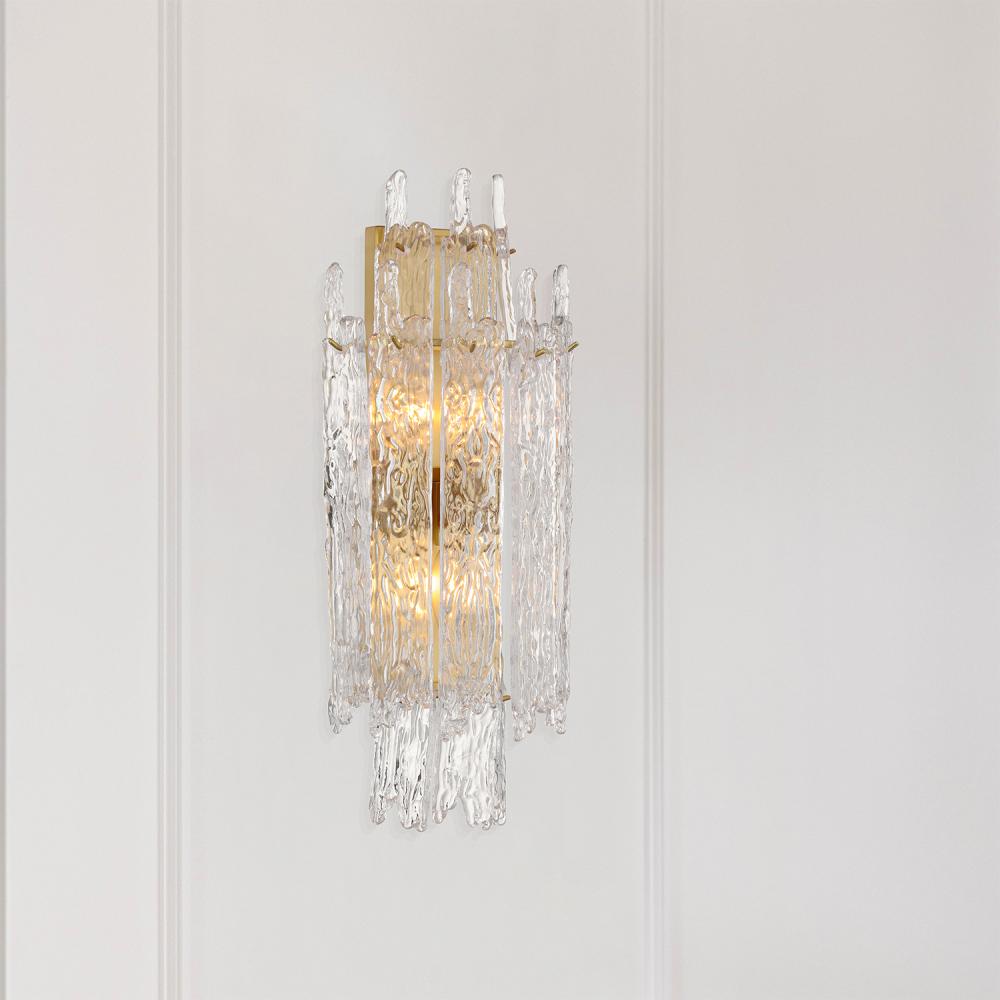 The Ackerly Collection showcases stunning ice glass, a textured material that resembles frozen or cracked ice. Its frosted, crystalline surface uniquely scatters light, producing a soft, diffused glow. This organic, sculptural effect adds a modern yet slightly retro touch to the design. The Ackerly Collection combines elegance with an artistic, edgy aesthetic, making it a standout in any space.