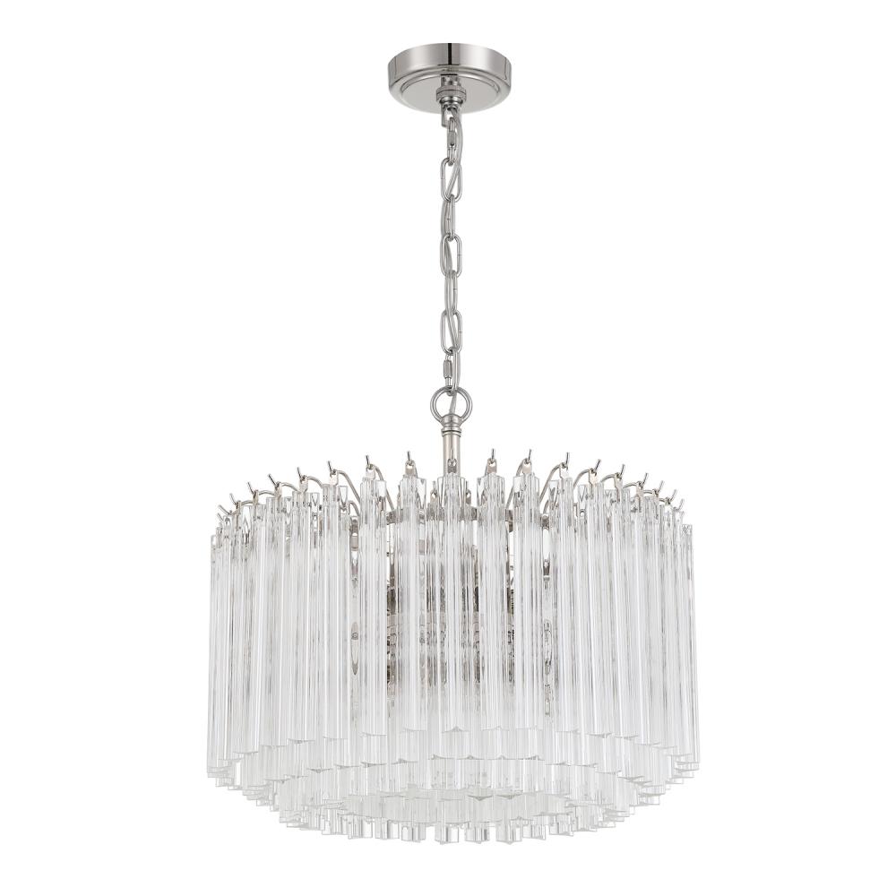 The Lofton Collection showcases mid-century sophistication with its stepped, tiered design and distinctive Triedri glass rods. Created using a technique that involves making triangular cuts on the glass, the Triedri method results in a faceted, crystal-like appearance that enhances sparkle and depth. The glass gracefully cascades downward and inward, framed in polished nickel or aged brass. This dynamic design ensures that the Lofton Collection remains a luxurious and visually striking centerpiece, with its facets reflecting light in captivating ways from any angle.