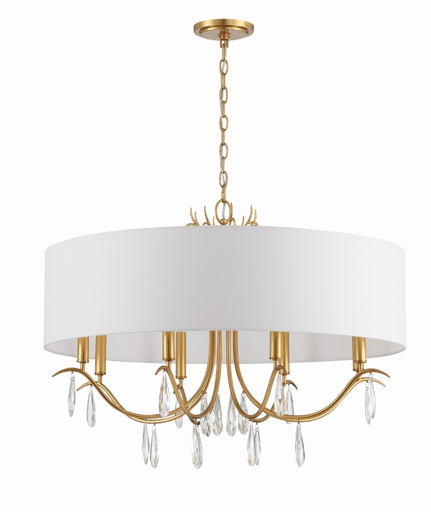 Rollins drum chandelier is a classic design versatile to fit traditional and modern settings. A large white round silk shade beautifully contrasts its Antique Gold finish. The organic inner metal frame features swopping arms and elongated crystal drops. This elegant collection provides an elevated and timeless look to an interior setting.
