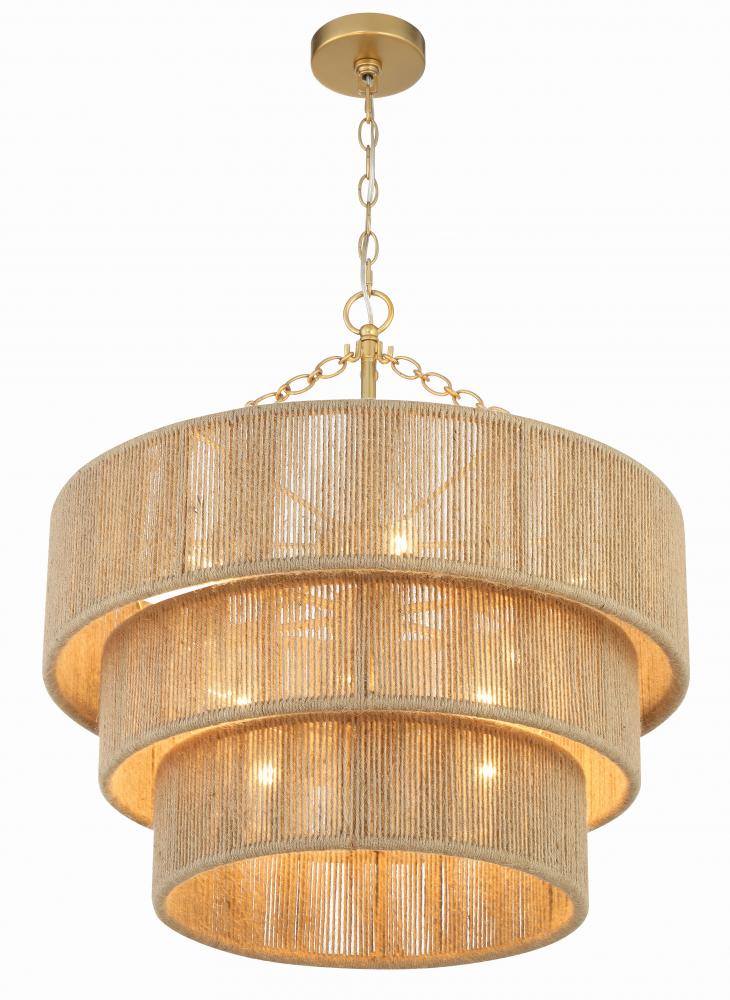 The Shyla Chandelier is a stunning blend of form and function. Crafted with modern sensibilities in mind, it features a tiered jute design and a gold chain adorned with oval and round details. The jute-wrapped structure adds a textural element, creating a relaxed and refined ambiance. With a warm and cozy glow, it is the perfect lighting solution for various interior styles, thanks to its simple and versatile design.