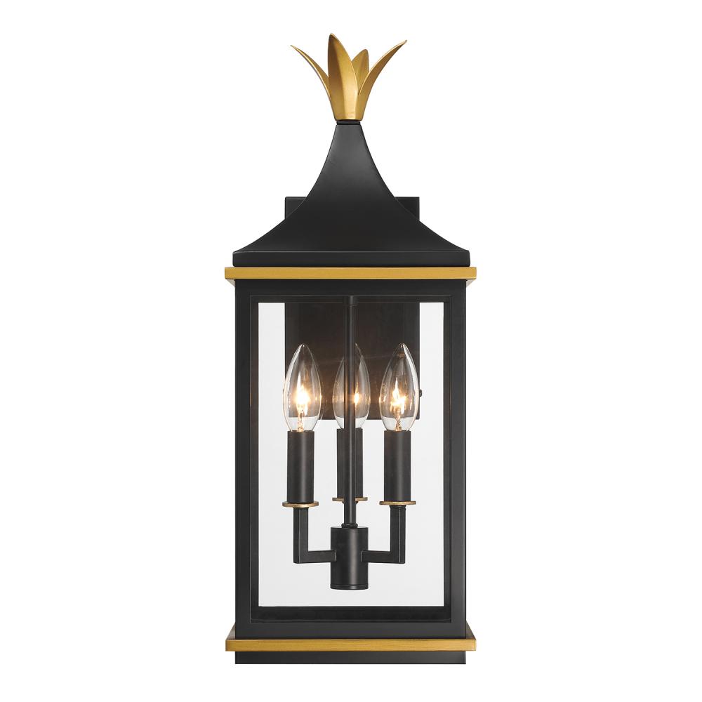 The Simpson Outdoor Collection features a lantern-style design with a two-tone finish. Its elongated rectangular frame, elegant glass panels, and candelabra bulbs create a classic look with a contemporary edge. The collection includes two options for customizing the top: a gold crown cap for a traditional flair or a sleek angled loop for a more contemporary appearance. This versatile design adds a stylish touch to any outdoor setting.