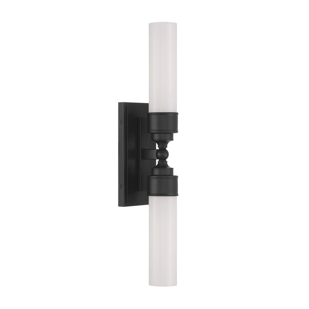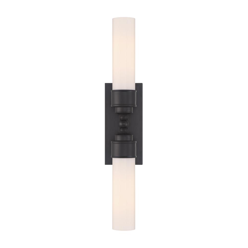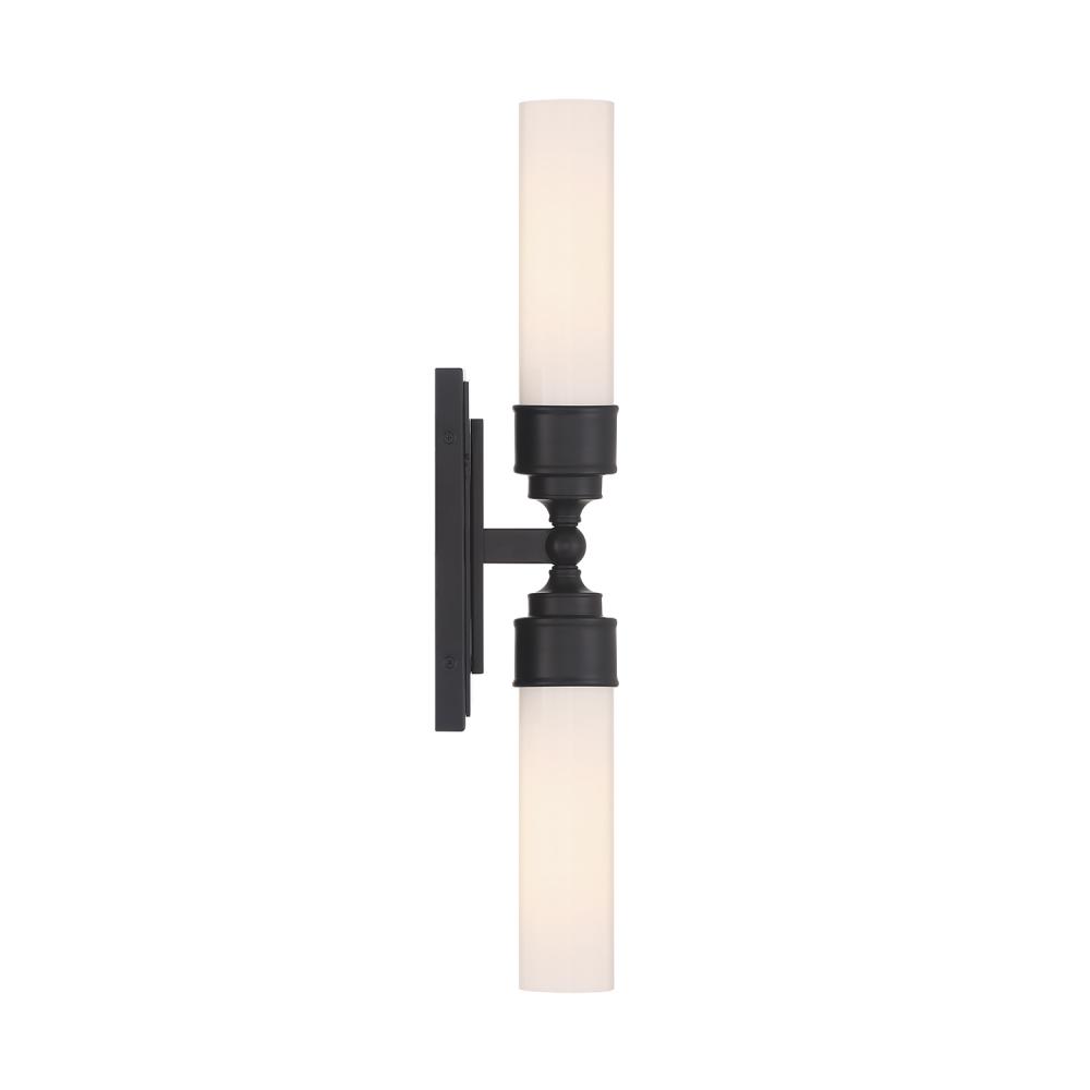 The Wilcox collection includes a white cylindrical glass shade and a rectangular back plate with stepped detailing. It is damp-listed for safe use in moisture-prone areas. The collection offers a single light option, suitable for mounting on either side of a mirror, and a double light option, perfect for placing over a vanity. This elegant fixture adds a sophisticated touch to bathroom spaces.