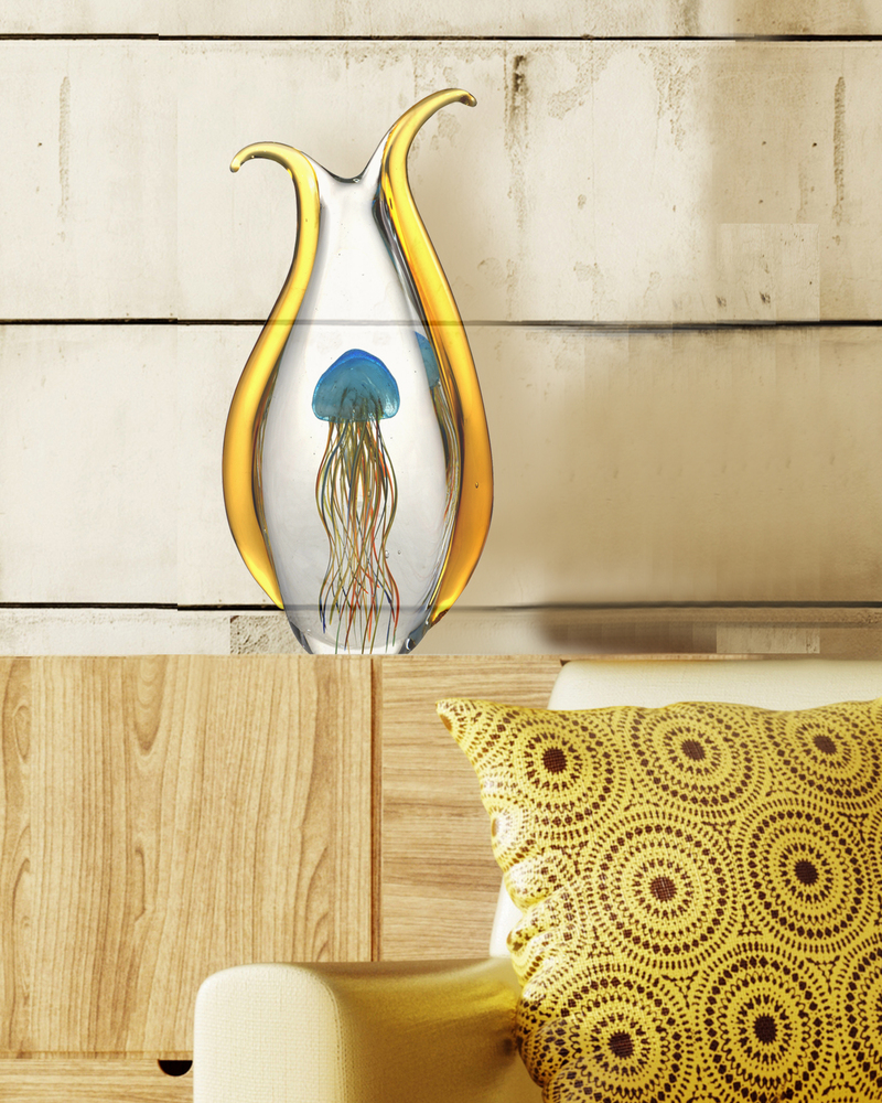 L.C. Tiffany was well known for taking inspiration for his designs from things found in nature. Our artisans have recaptured Tiffany’s love of nature in this breathtaking Jellyfish Figurine. The colorful sculpture is vase shaped and crafted of hand blown Favrile art glass. The sculptures outer edges are bright yellow to catch the eye. Inside, hovering in the midst of a clear glass background floats a ethereal jellyfish. His head is deep ocean blue, with long tentacles in yellow, red, black and orange creating a kaleidoscopic display that will add a bright pop of color in any room. A lovely gift for the aquatic enthusiast, our Jellyfish Figurine is destined to become a cherished family heirloom to be passed from one generation to the next.