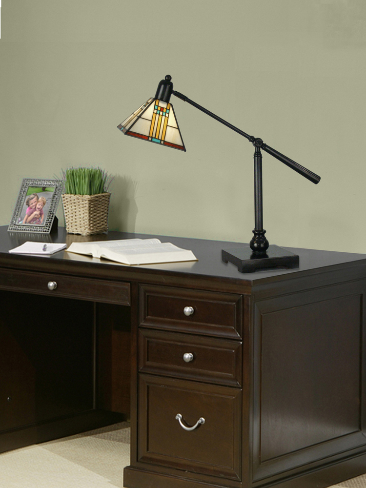 Both attractive and functional, the Mission bank table lamp features more than 100 pieces of art glass, each individually hand rolled and set in copper foil. The mission style shade is done in a traditional window pattern in beige, blue, red and butterscotch. The base is a classic reader style with a fully adjustable arm and is finished in mica bronze.