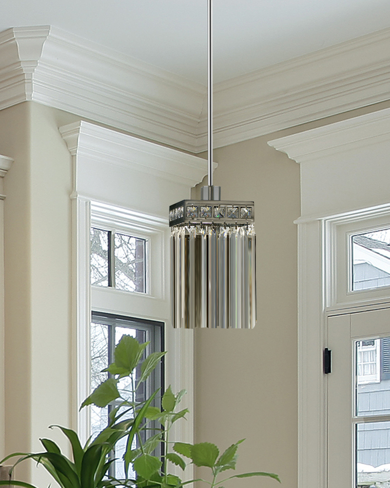 Our stunning Bradford Crystal Mini Pendant is a contemporary classic that will accentuate any decor in your home well into the 21st Century and beyond. The lovely square shade begins with a metal framework at the top that is finished in glistening Polished Chrome. A row of 5 faceted crystal jewels runs along the top of each of the 4 sides. Just below, hangs a row of 6 elongated crystal spikes that wrap around the light fixture within to create the body of the shade. Each spike hangs freely to create movement and a shower of sparkles from the 60W bulb (bulb not included) when the pendant is illuminated. Bradford hangs gracefully from a metal ceiling canopy and sleek metal tube, both finished to match the framework in sleek Polished Chrome. An ideal choice when hung in multiples over an elegant bar, kitchen island or gaming table, our Bradford Crystal Mini Pendant will provide your family with a lifetime of elegantly reliable lighting no matter where you choose to hang it.