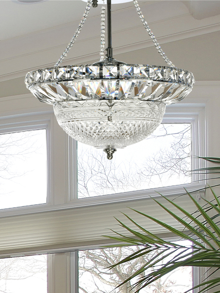 Easily increase the drama in any decor with our Crystal Hills Hanging Fixture. The magnificent shade is a generously sized inverted bowl of solid crystal. The upper edge features square crystal faceted in a diamond shape. Each subsequent layer is faceted in a seemingly never-ending variety of shapes designed to cast a brilliant shower of sparkles about the room with the fixture is lit. Crystal Hills hangs beautifully from a metal ceiling canopy and center support tube, finished in glistening polished chrome. A pair of decorative beaded crystal chains adds even more sparkle, if possible. A matching metal finial beautifully completes the look. Crystal Hills is absolutely breathtaking when hung over a formal dining table and also makes a stunning way to greet your guests when hung in a formal foyer. No matter how you display it, our Crystal Hills Hanging Fixture will provide your family with a lifetime of artistically elegant lighting.