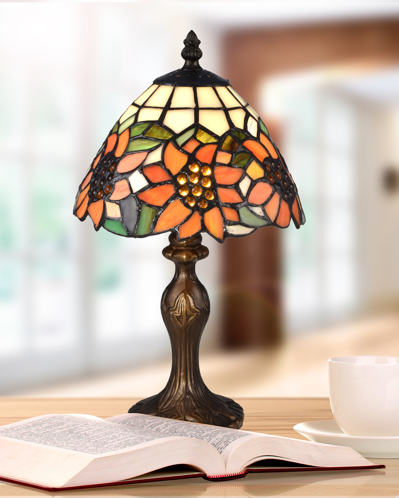Bright and lively, our Discovery Table Lamp’s vintage feel will add a summery splash of color to your home. The deep dome shade features a background of light amber panels that are set in a grid pattern. A brilliant band of sunflowers in vivid orange and yellow runs around the circumference of the shade. The flowers are nestled amidst green and gold foliage and at each blossom’s center, a grouping of amber glass gem “seeds” adds texture and sparkle. The finely cast base is finished in Antique Bronze and features an allover intricate design. The shade is topped with a matching flame finial and vase cap with cut out detailing. Ideal for smaller nightstands and end tables, our Discovery Table Lamp also is a fantastic desk lamp on smaller desks and worktables.