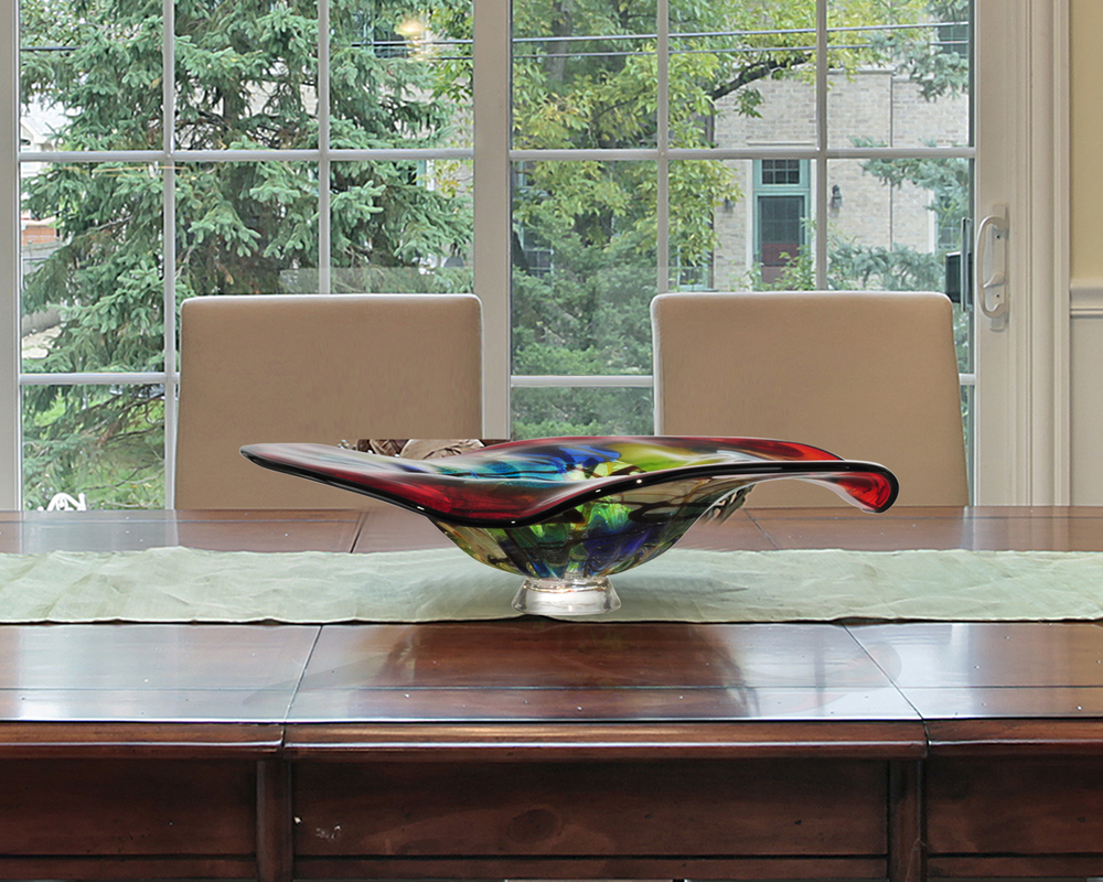 Our Favrile Art Glass Collection Plates are an ideal way to express your unique style and taste. Each plate can be hung alone or in multiples with the included bracket. The Hankley plate is a contemporary blend of leafy green sky blue and light blue that is swirled together at the plate’s center. The outside is bordered by deep, vivid red. Rich black is drizzled throughout the entire design and also borders Hankley’s outside edge. Not just for walls, our Favrile Art Glass Collection plates can be displayed as a centerpiece on a dining or coffee table; your creativity is limited only by your imagination.