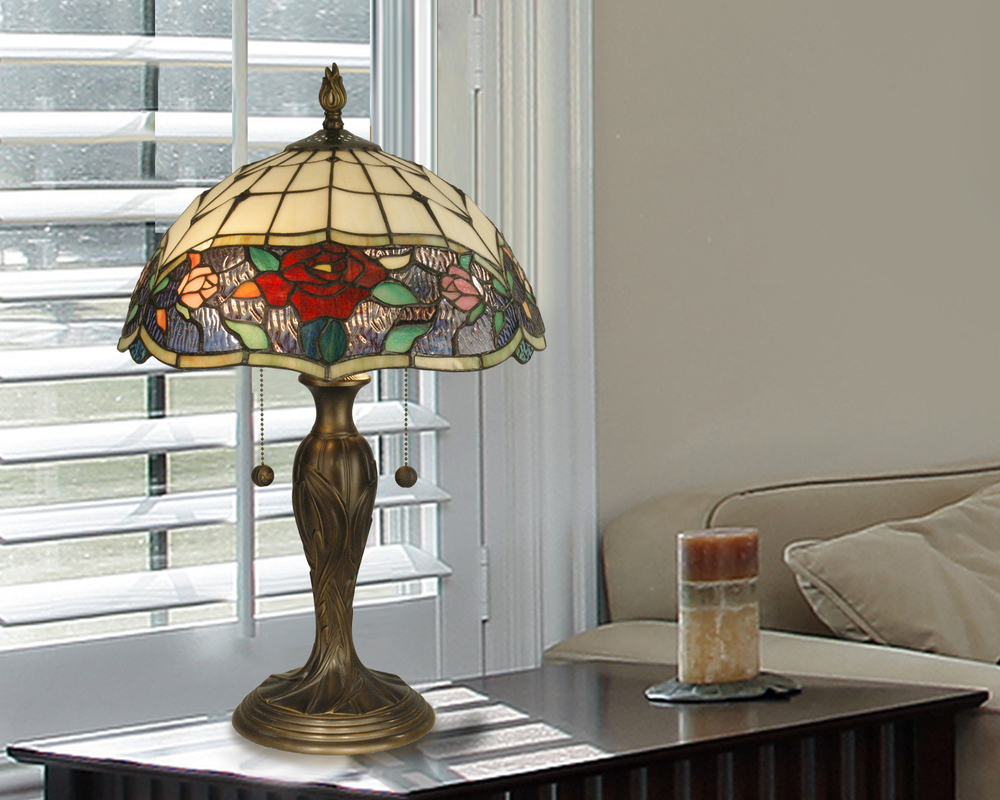 Our Malta Table Lamp Combines Crisp Geometric Elements With Graceful Florals For A Look That Will Be Yours Alone. The Top Of The Dome Shade Features A Background Of Creamy Natural Art Glass Panels, Separated By Bold Filigree And Accented With Art Glass Je