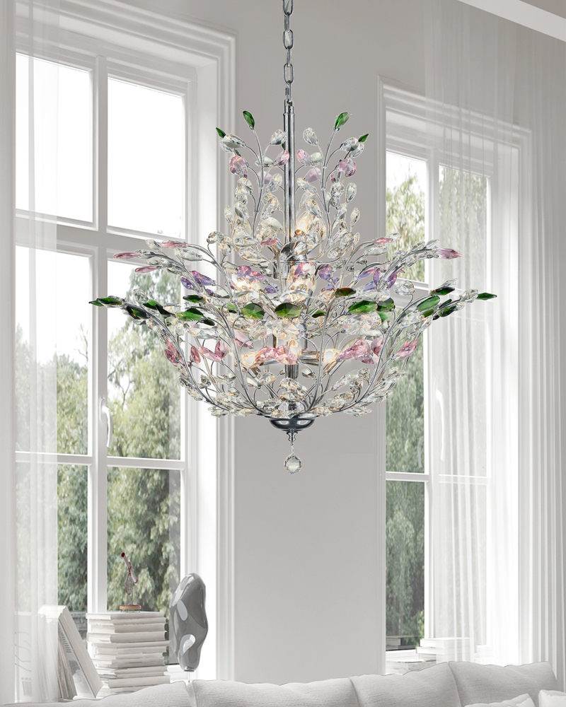 Our breathtaking Monaco Color Inverted Crystal Chandelier is a show stopping crowning touch in any home. The lovely 3 tiered fixture features a metal base that is finished in gleaming Polished Chrome. Layer upon layer of cut crystal leaves and blossoms in pink, lavender, green and green create an elegant look at a price that is easy on the pocketbook. Monaco hangs from a metal ceiling canopy, wire cable/chain and center support tube, all finished to match in Polished Chrome. We added a faceted crystal orb finial at the bottom for the perfect finishing touch. A perfect topper for an elegant formal dining area, our Monaco Color Inverted Crystal Chandelier also makes a fantastic way to greet guests when hung in foyers and entryways with higher ceilings.