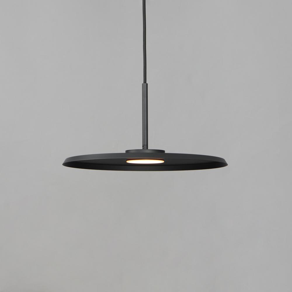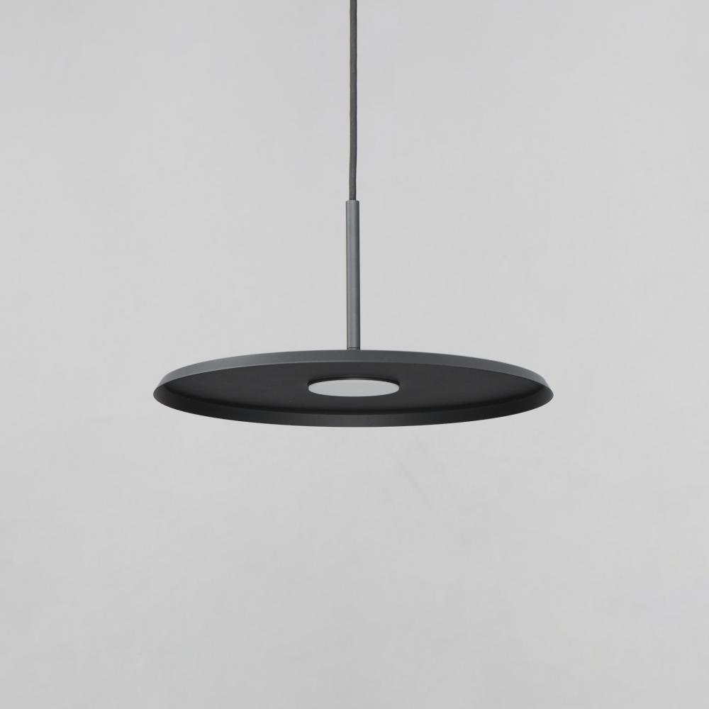 Wide flat discs house LED engines that disappear when viewed at the pendants edge. Supported at their center by thin tubes and black cable, machined aluminum housings feature laterally cut concentric circles drawing inspiration from the grooves in a vinyl