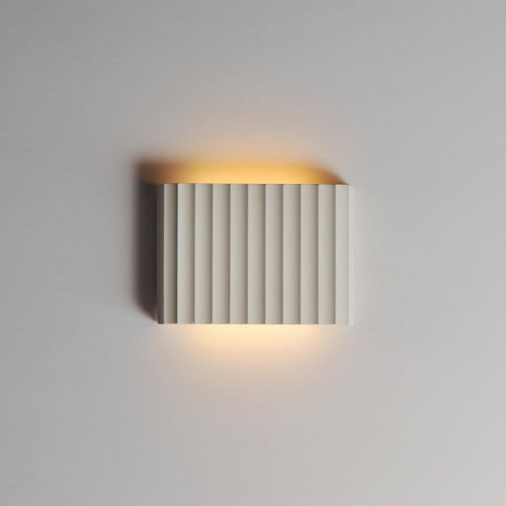 Long spans of fluted concrete panels blend Western classicism with modern technology. Scalloped concrete is finished in a Chalky White finish and suitable for damp locations. Choose from stem hung pendants or backlit wall panels that provide ambient light
