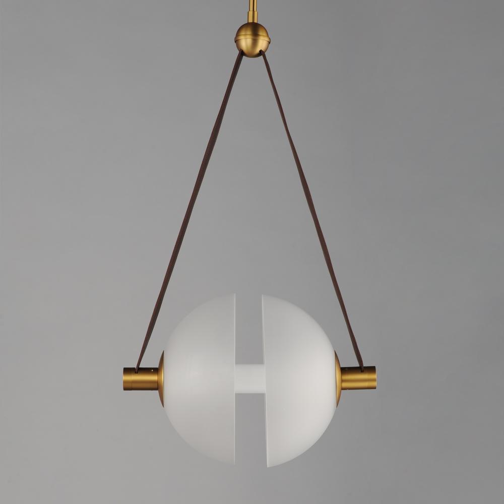 Send a message on the wire. Two semi-spherical frosted glass domes are separated by a tube of LED light and suspended by Tobacco Brown leather straps. The frames are complete in a contrasting Natural Aged Brass finish making the contemporary design softer